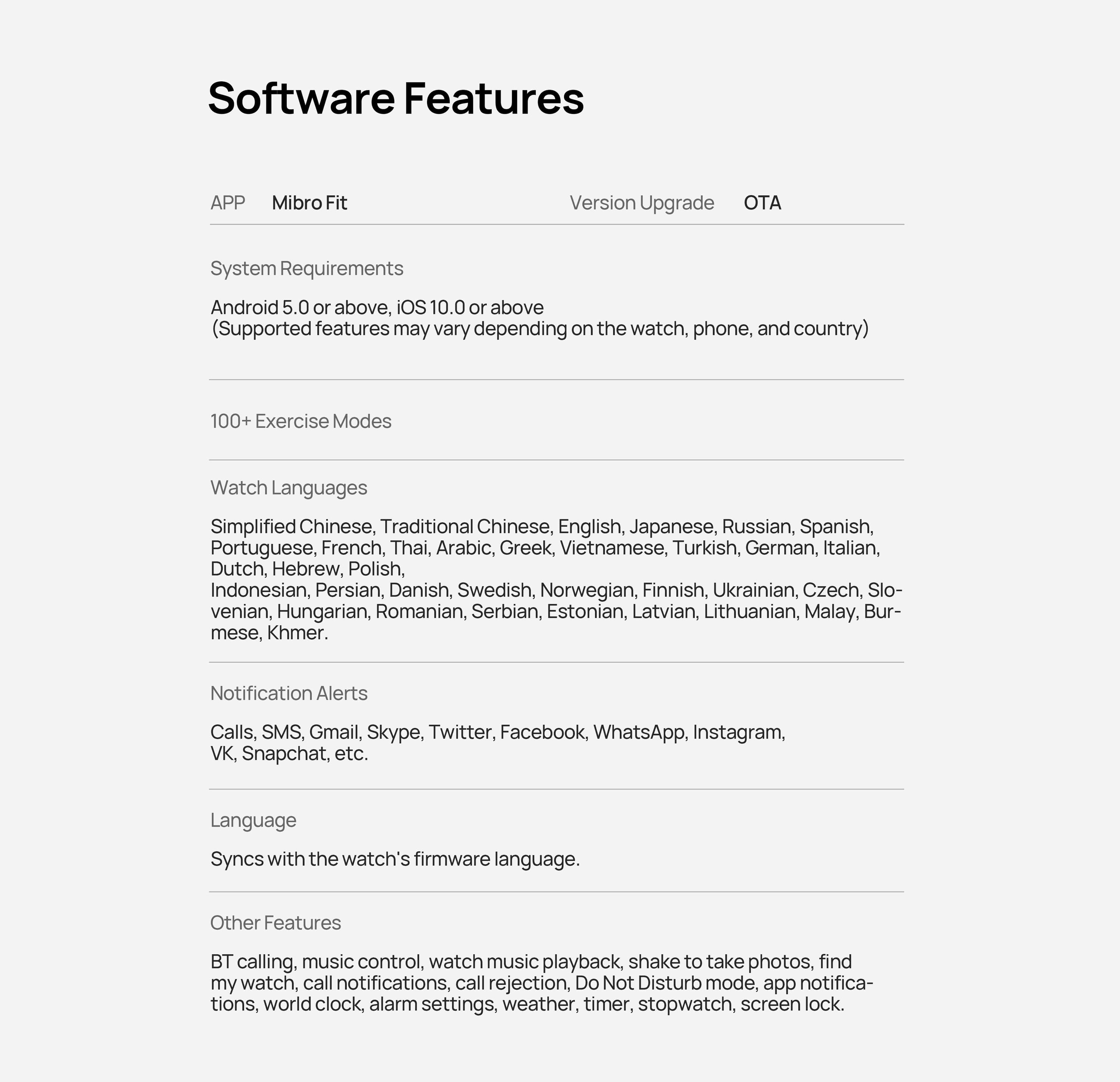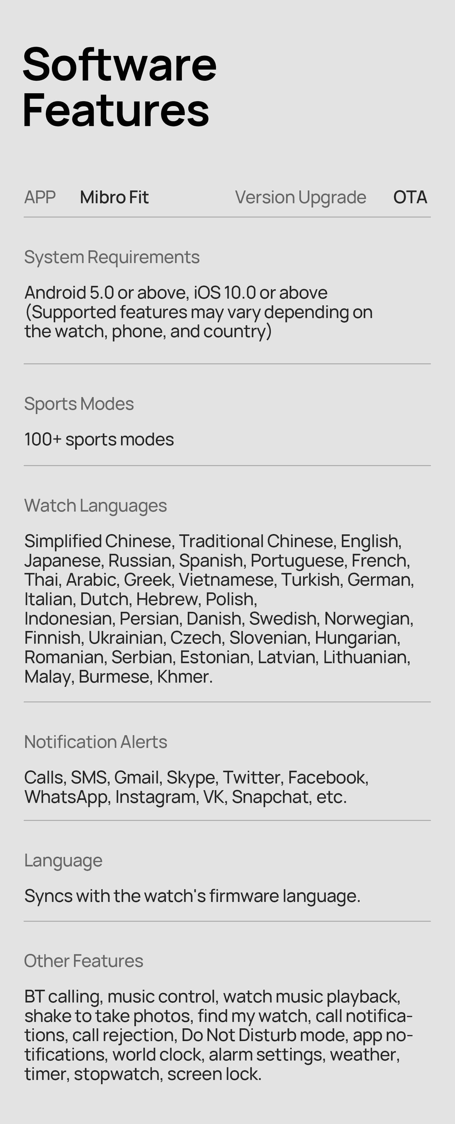 Android 5.0 and above, iOS10.0 and above. (Functions vary with specific watch models, mobile phones and countries)