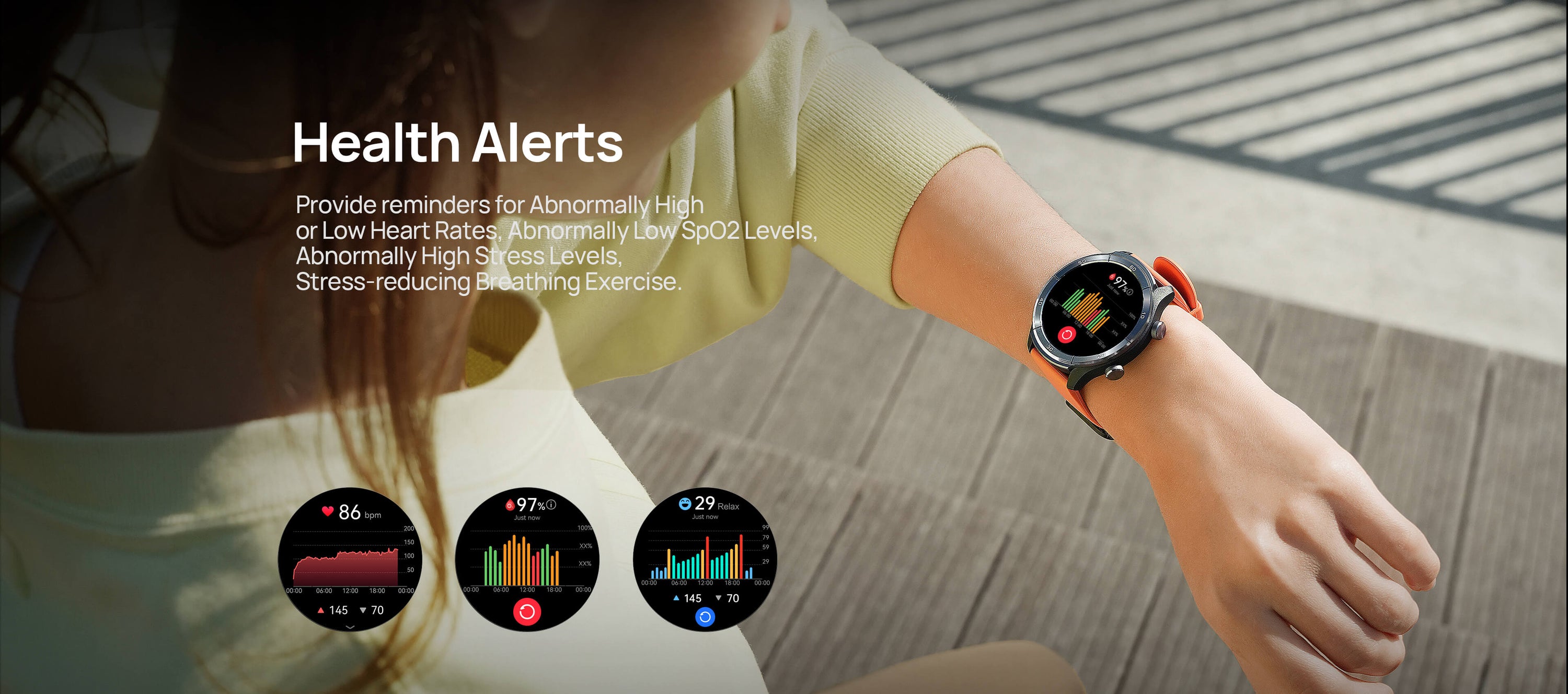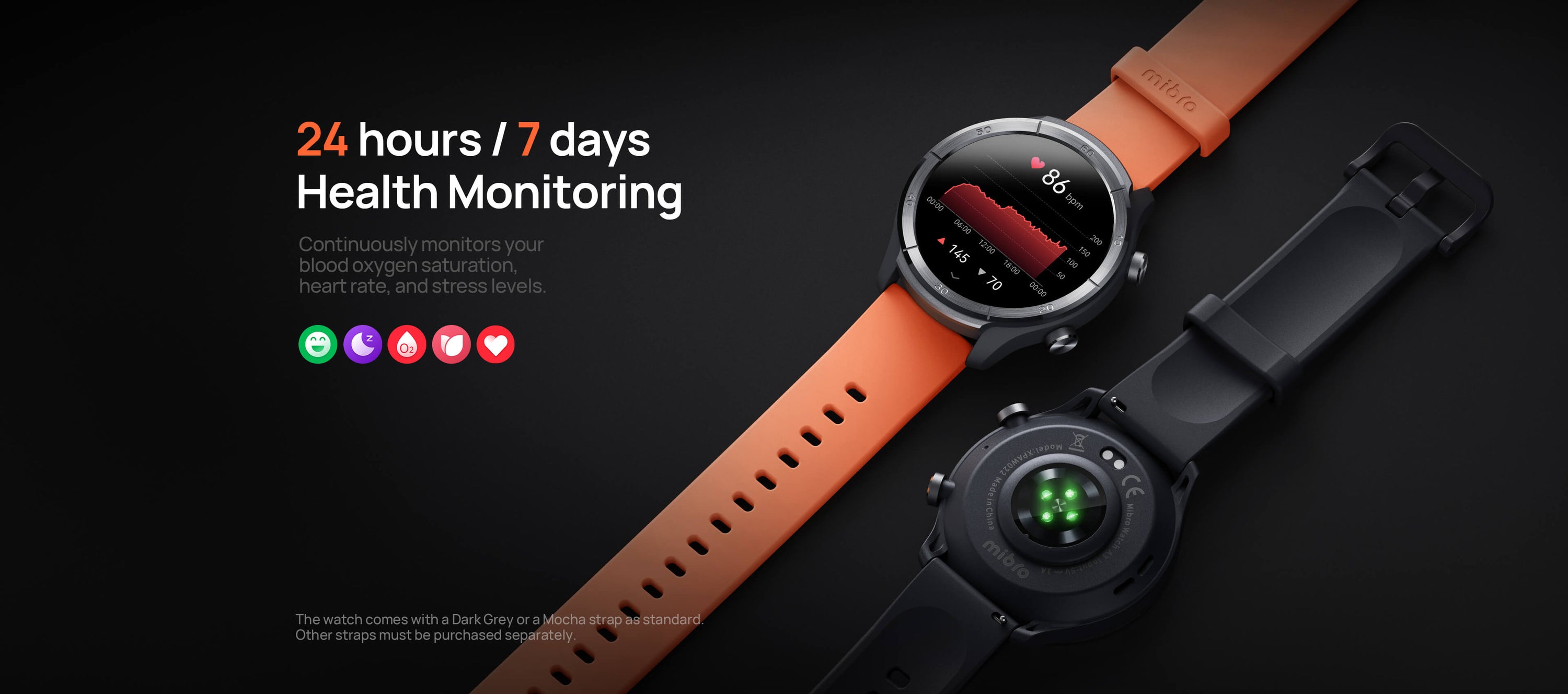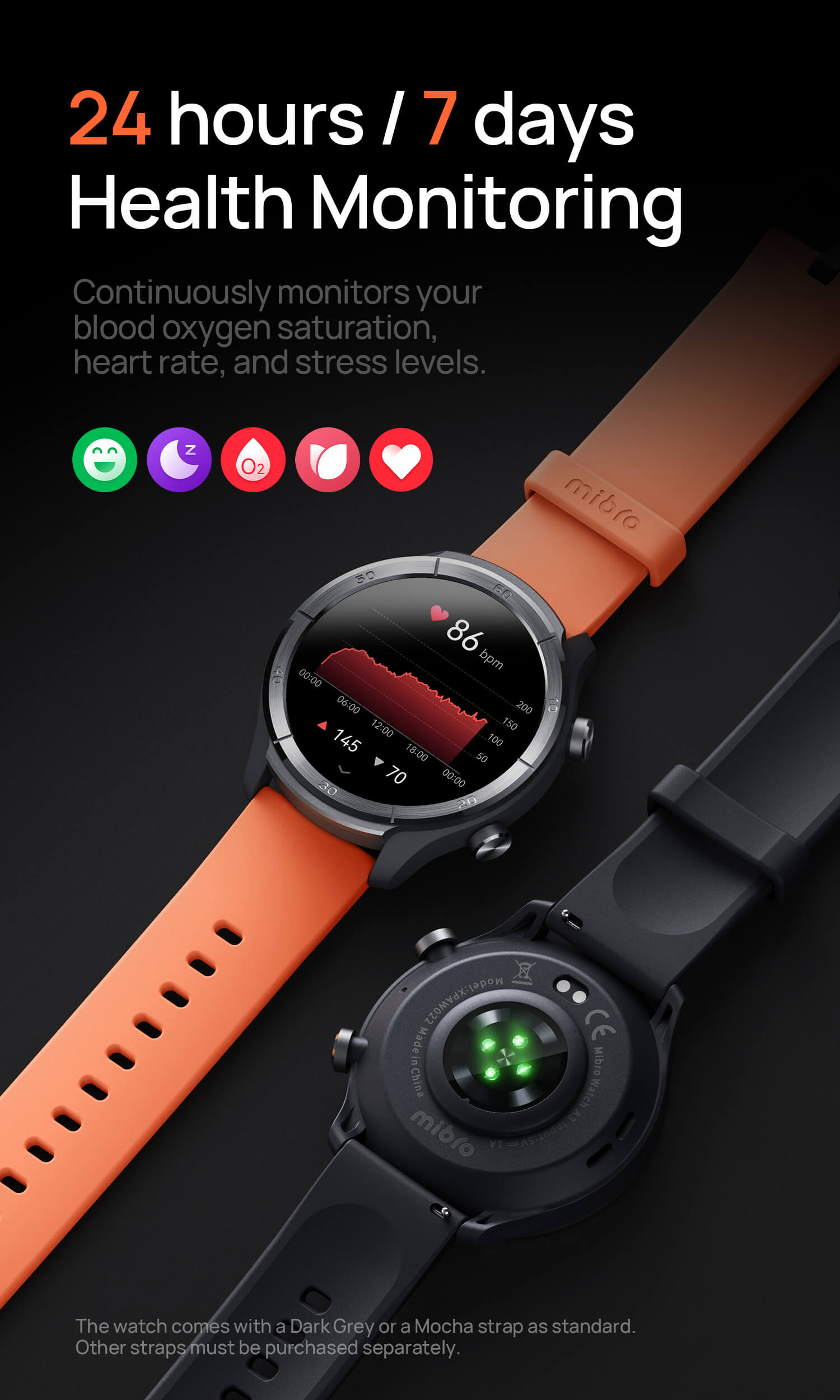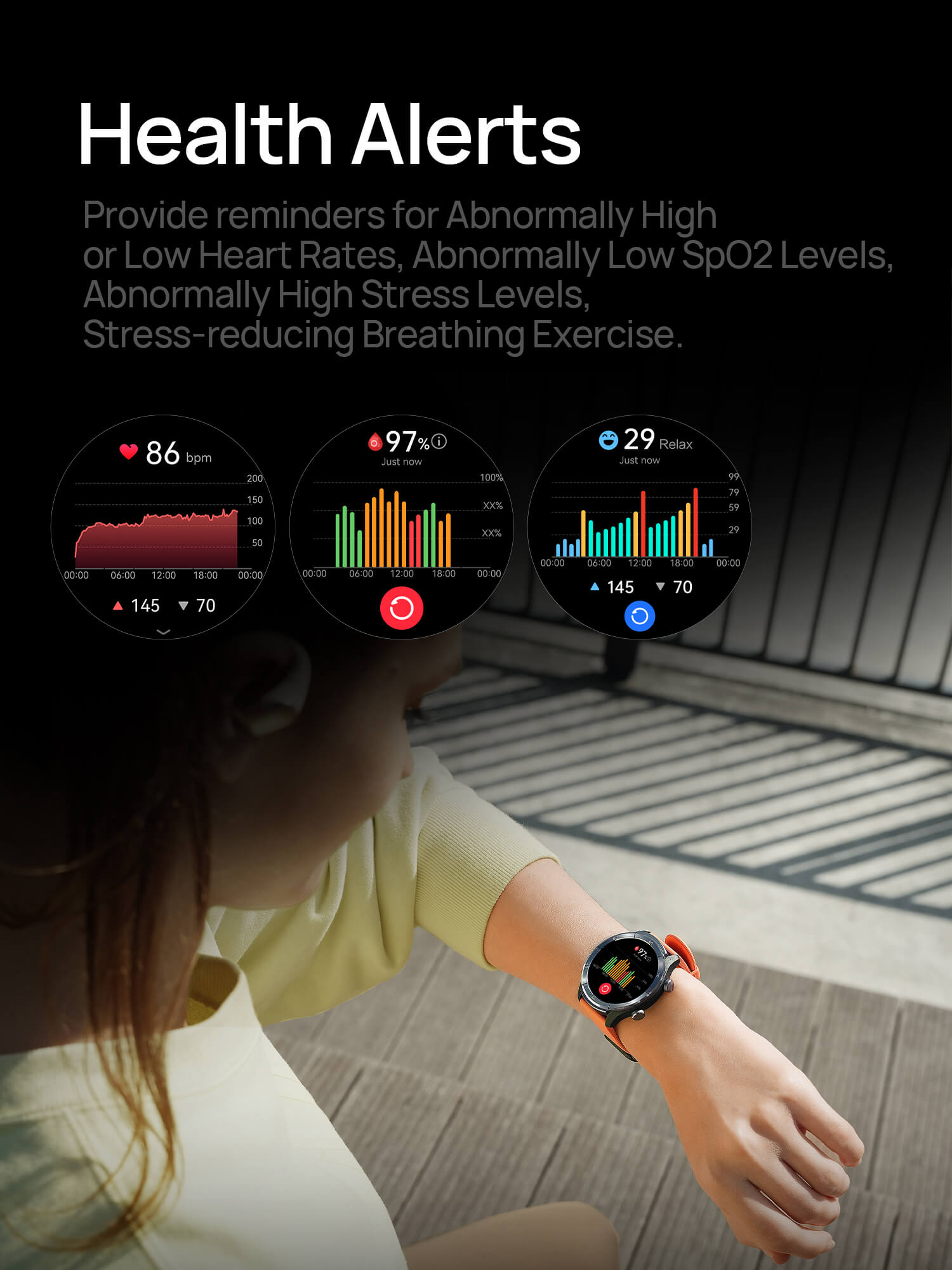 24/7 updated 4PD heart rate, SpO2, sleep,stress tracking,and breathing training.