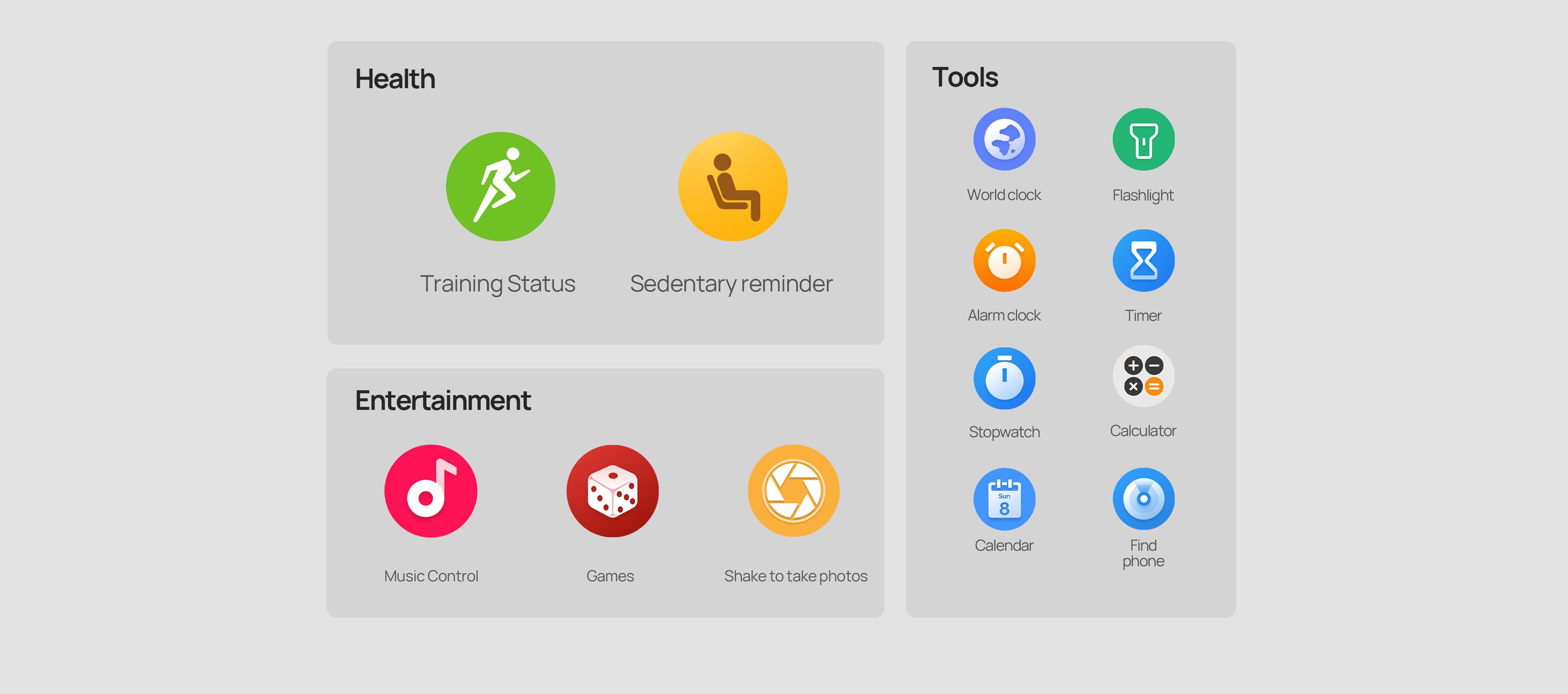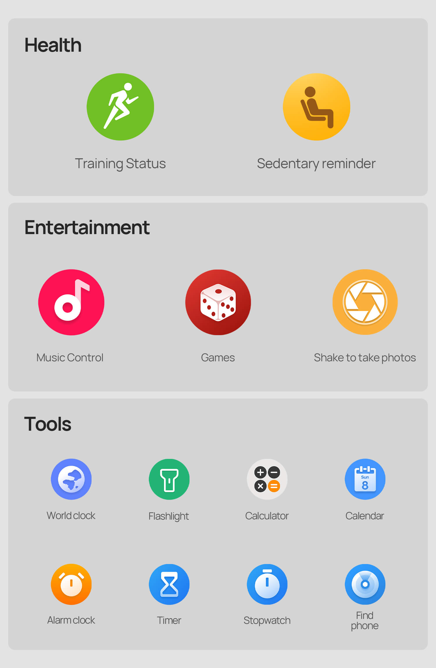 App message push,Weather push,Incoming call push,Health Reminder,Contact management,Find watch, Remote photographs,Waterface setting,Motions record, Sleep record, Healthy weekly..