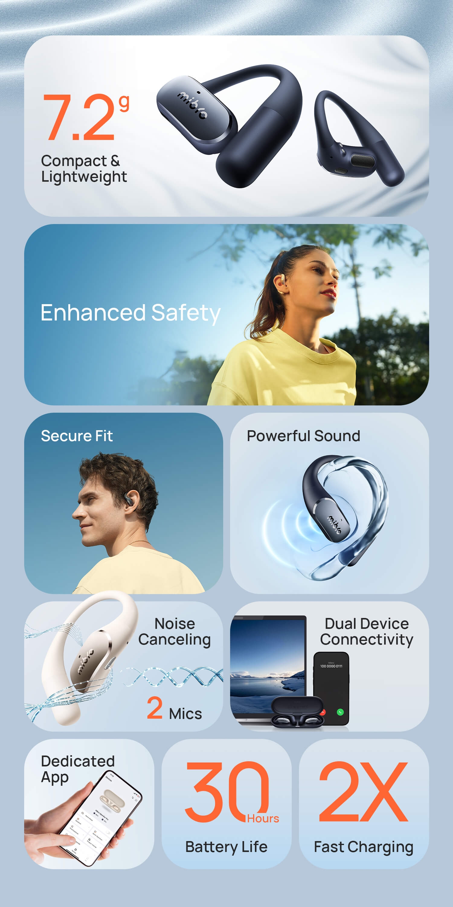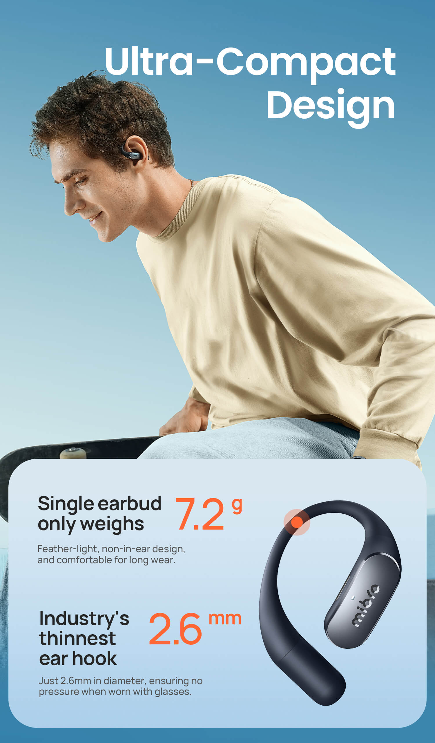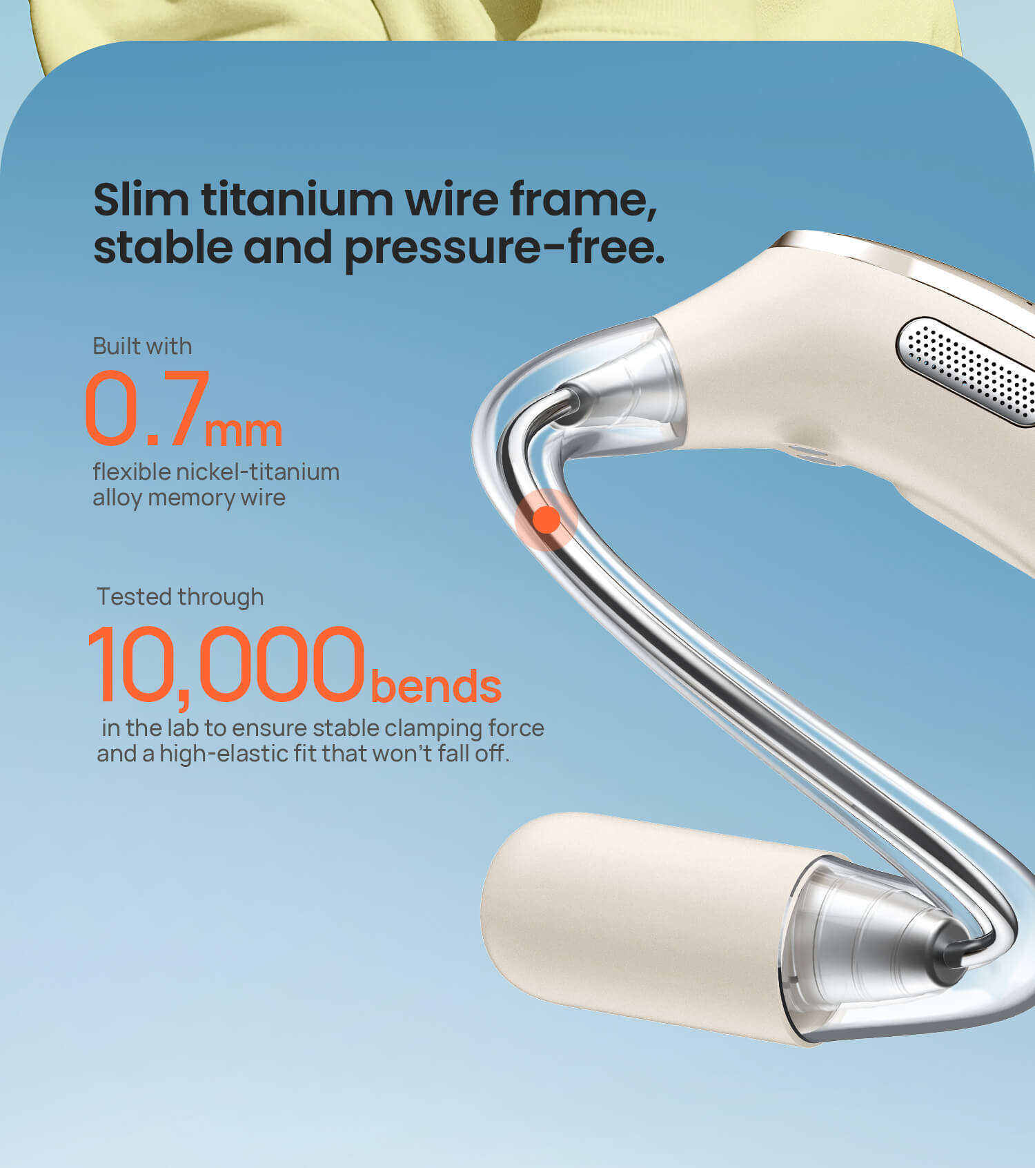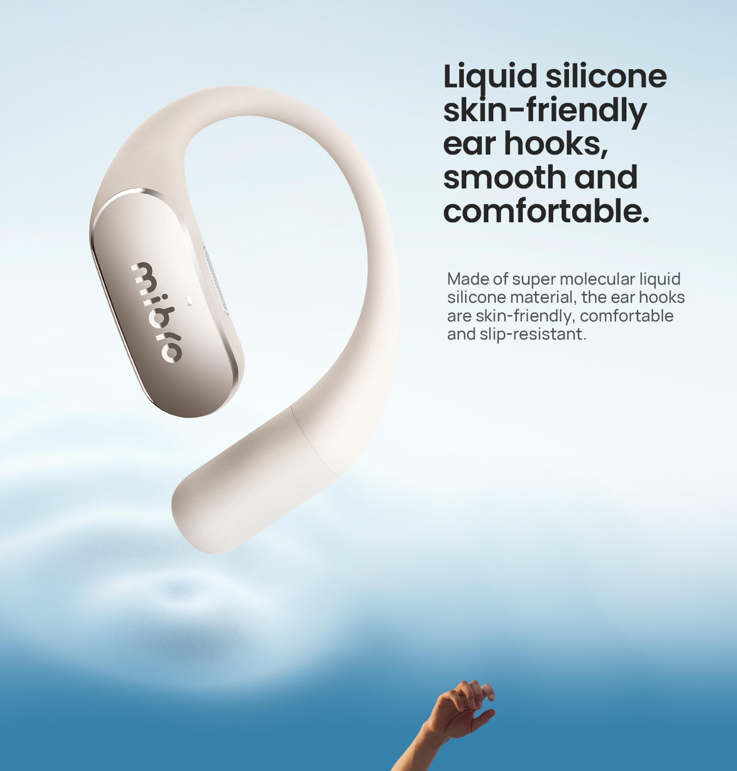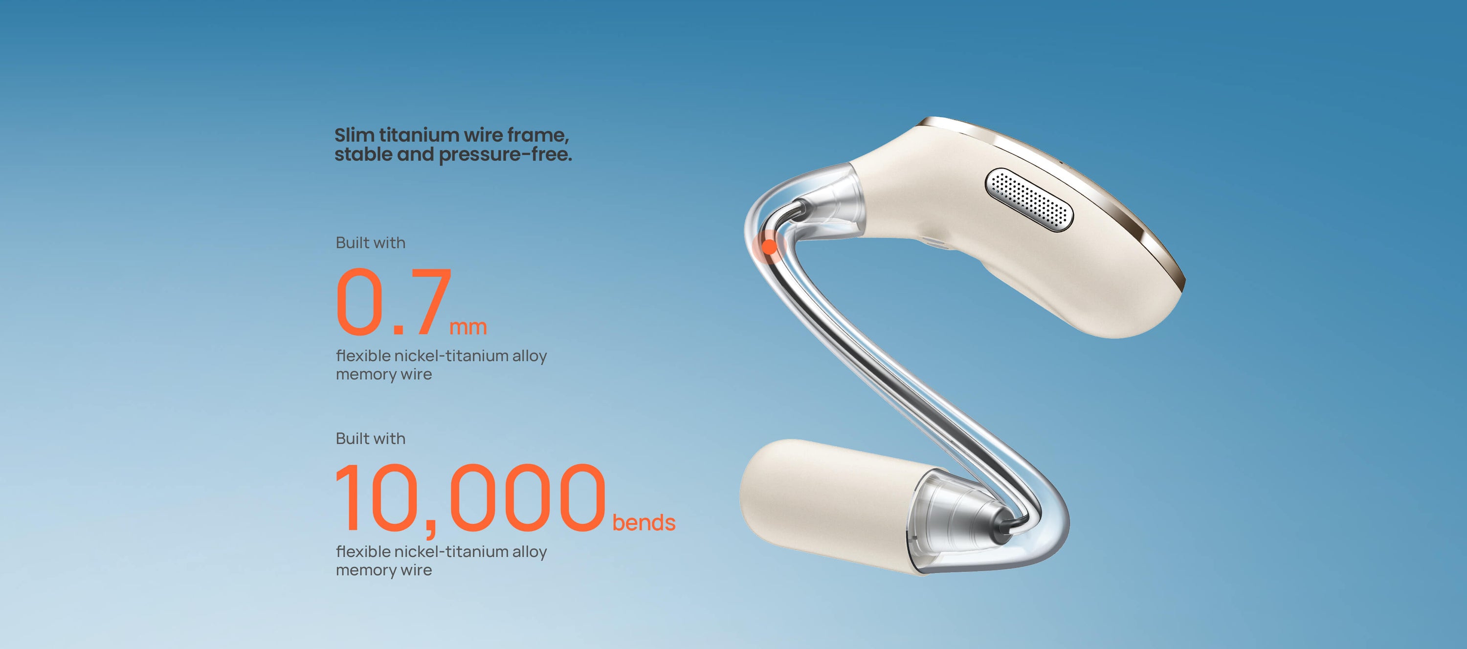 Single only 7.2g with an open-ear structure, it eliminates ear pressure. Made of slim titanium wire frame and super molecular liquid silicone material, the ear hooks are skin-friendly and slip-resistant.
