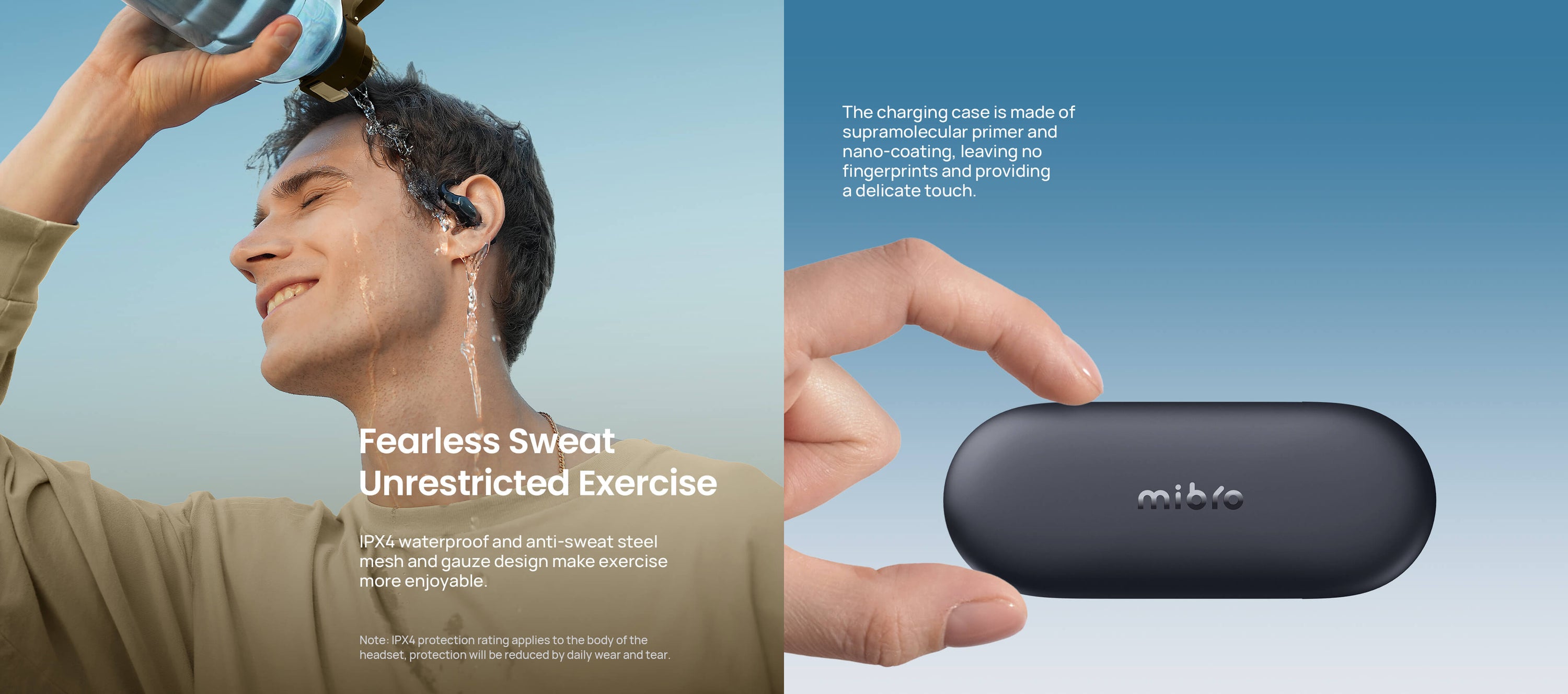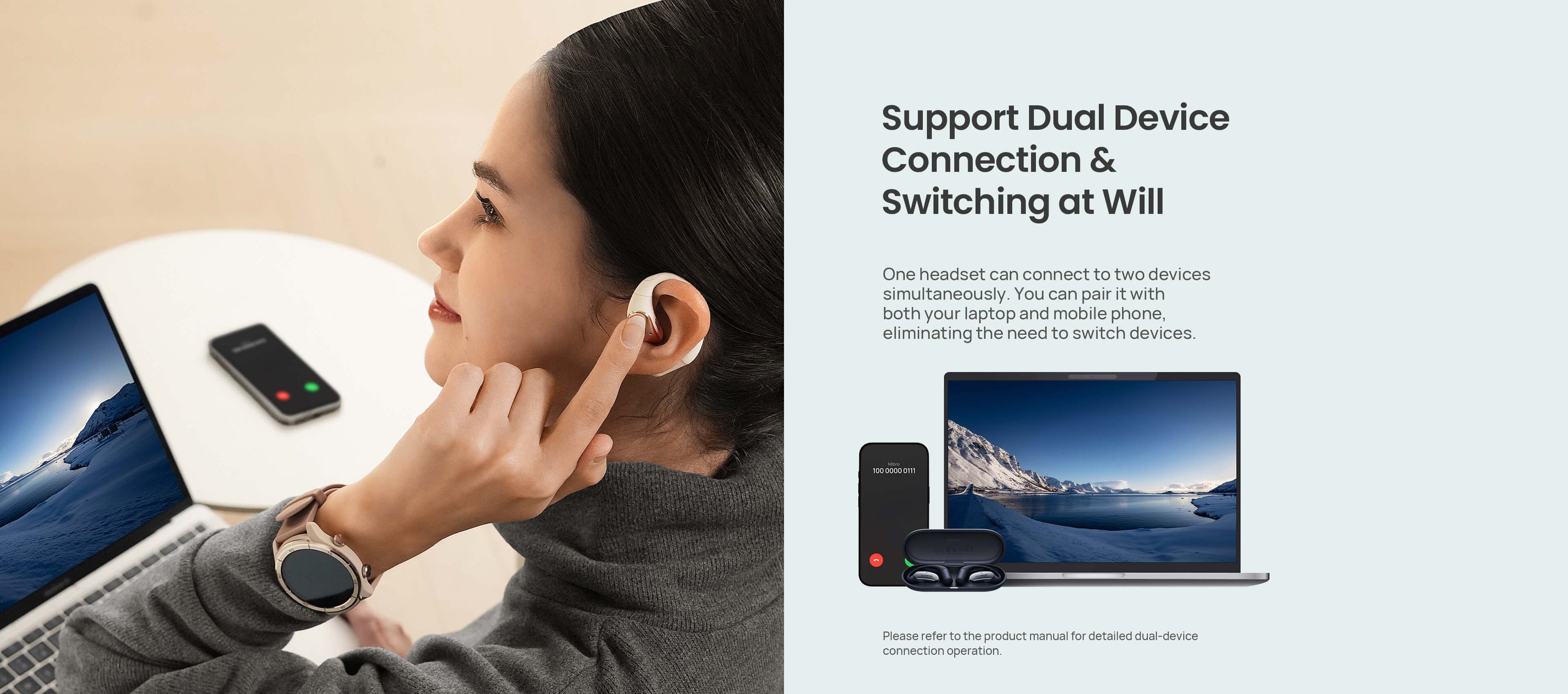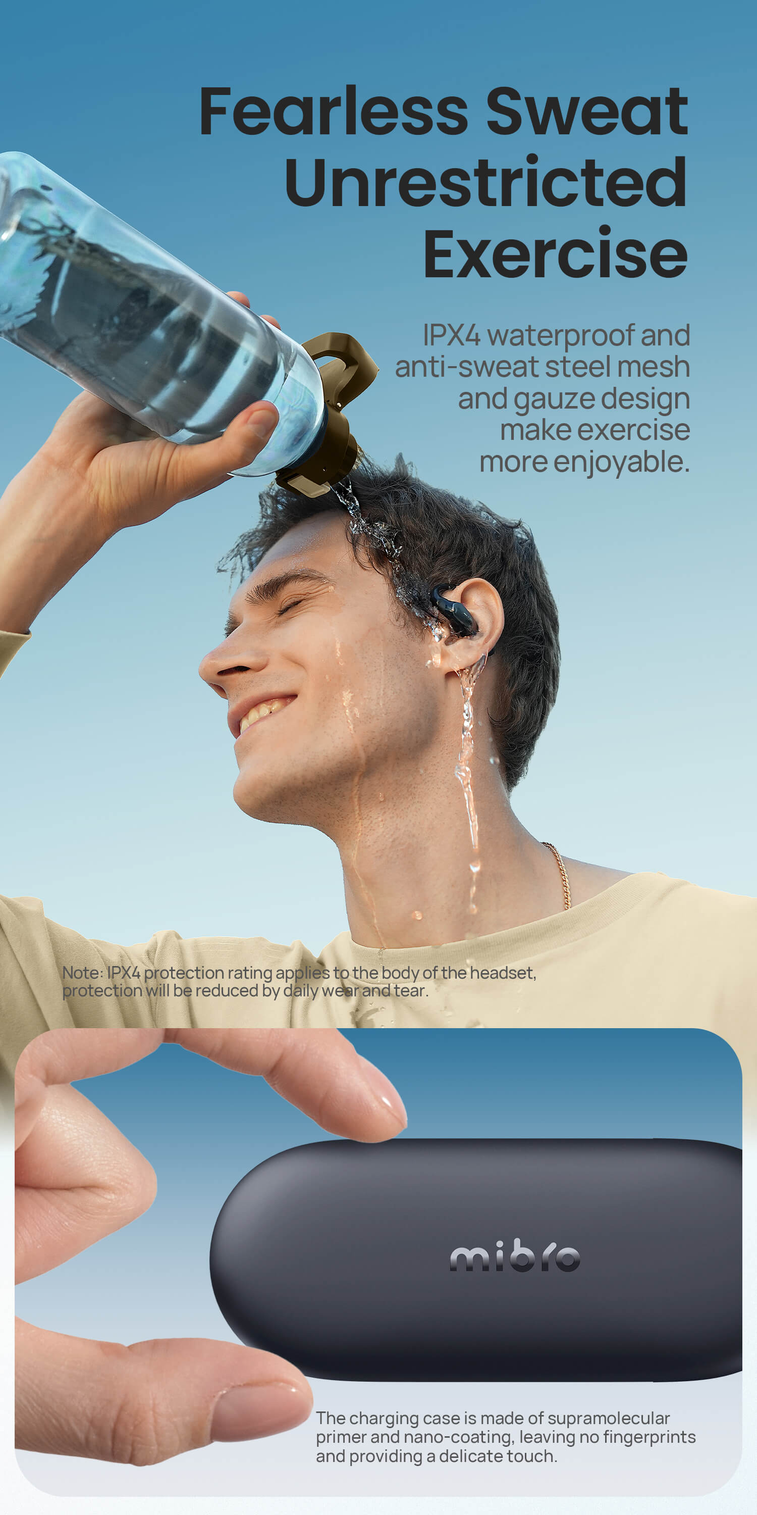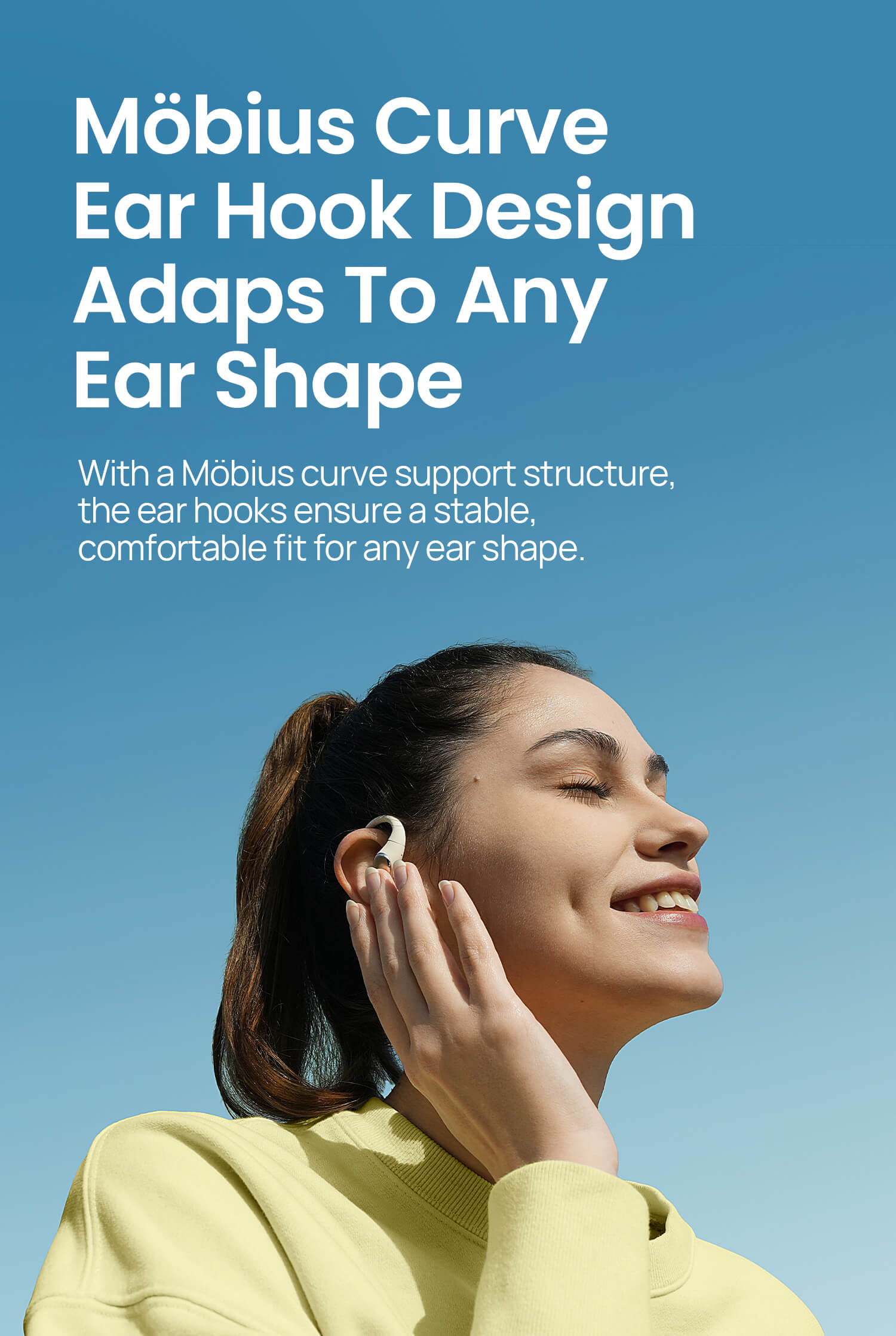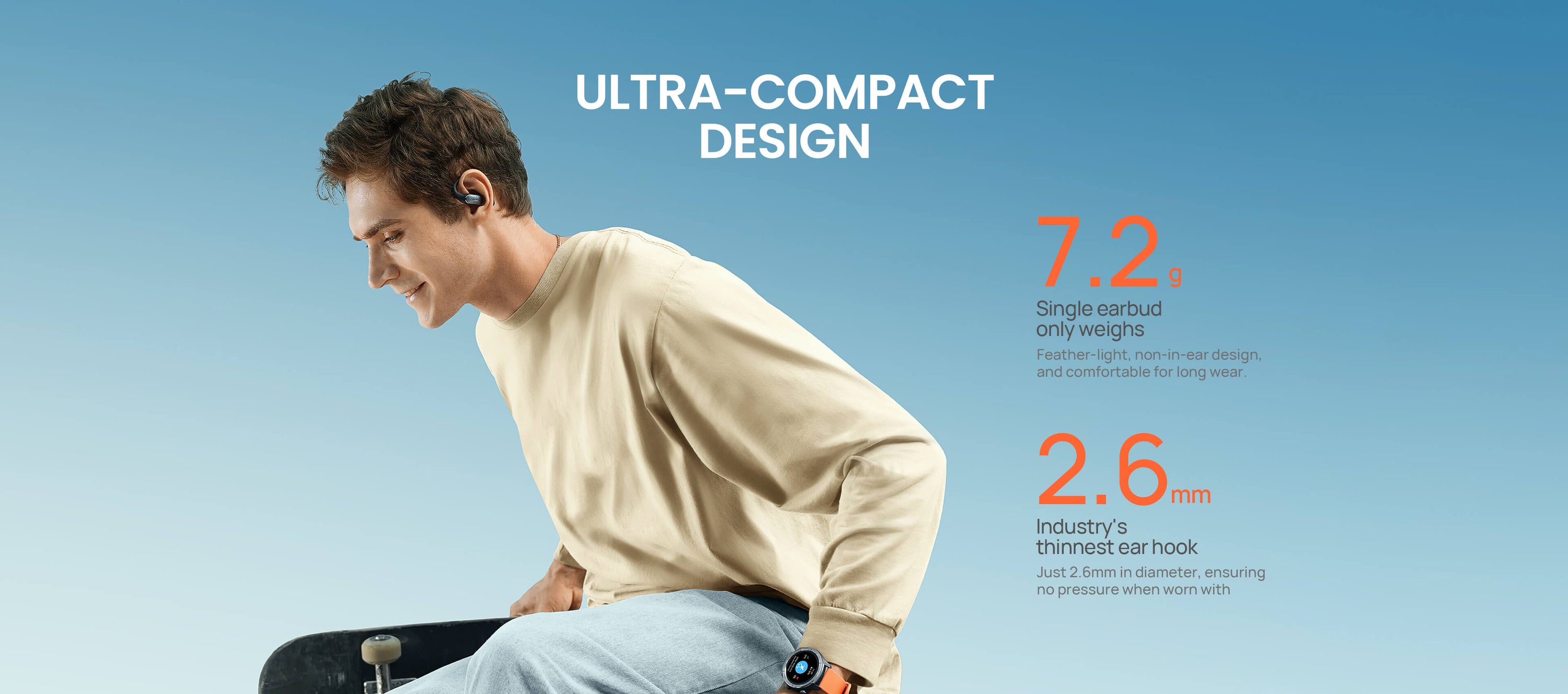 Single only 7.2g with an open-ear structure, it eliminates ear pressure. Made of slim titanium wire frame and super molecular liquid silicone material, the ear hooks are skin-friendly and slip-resistant.