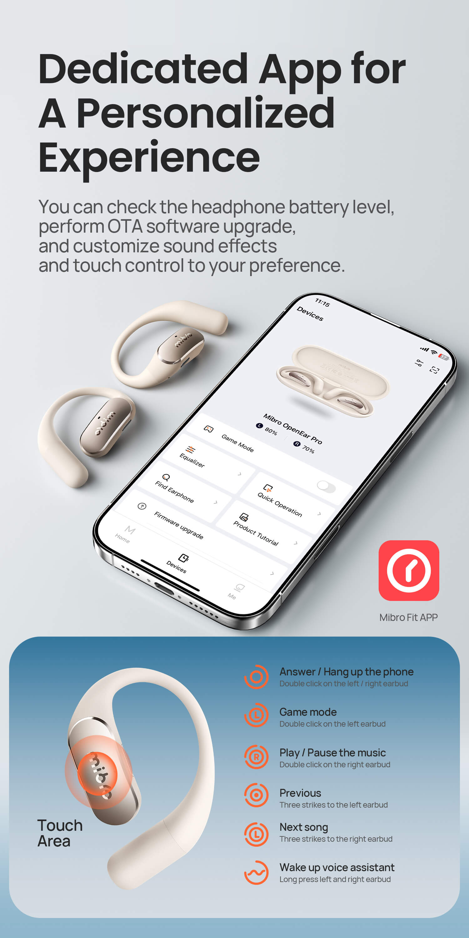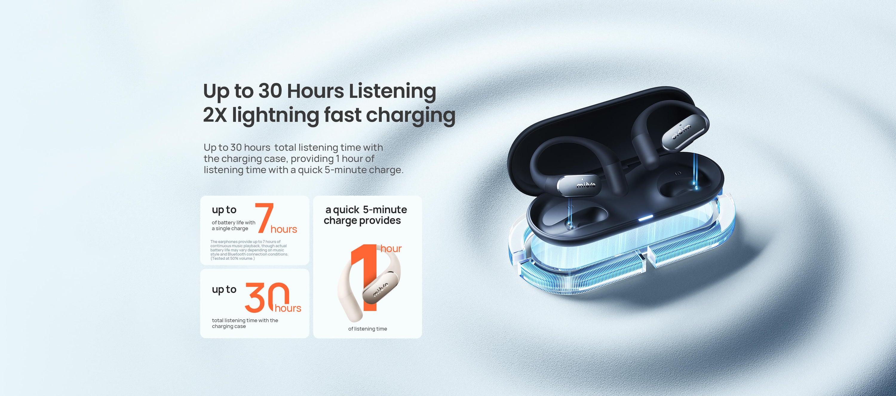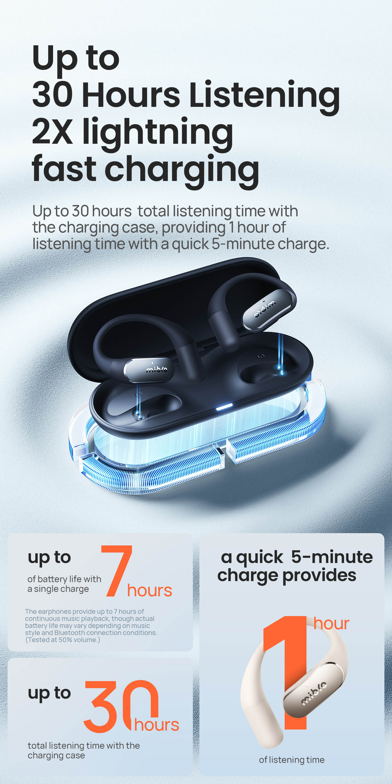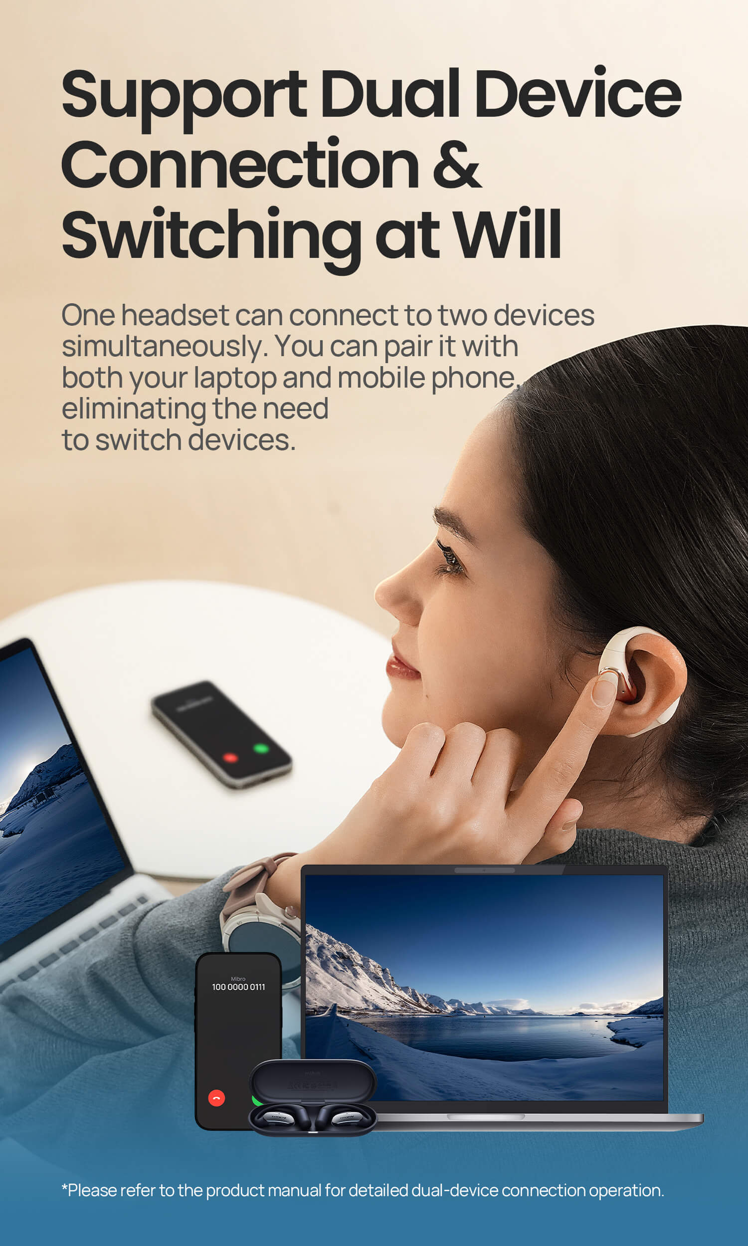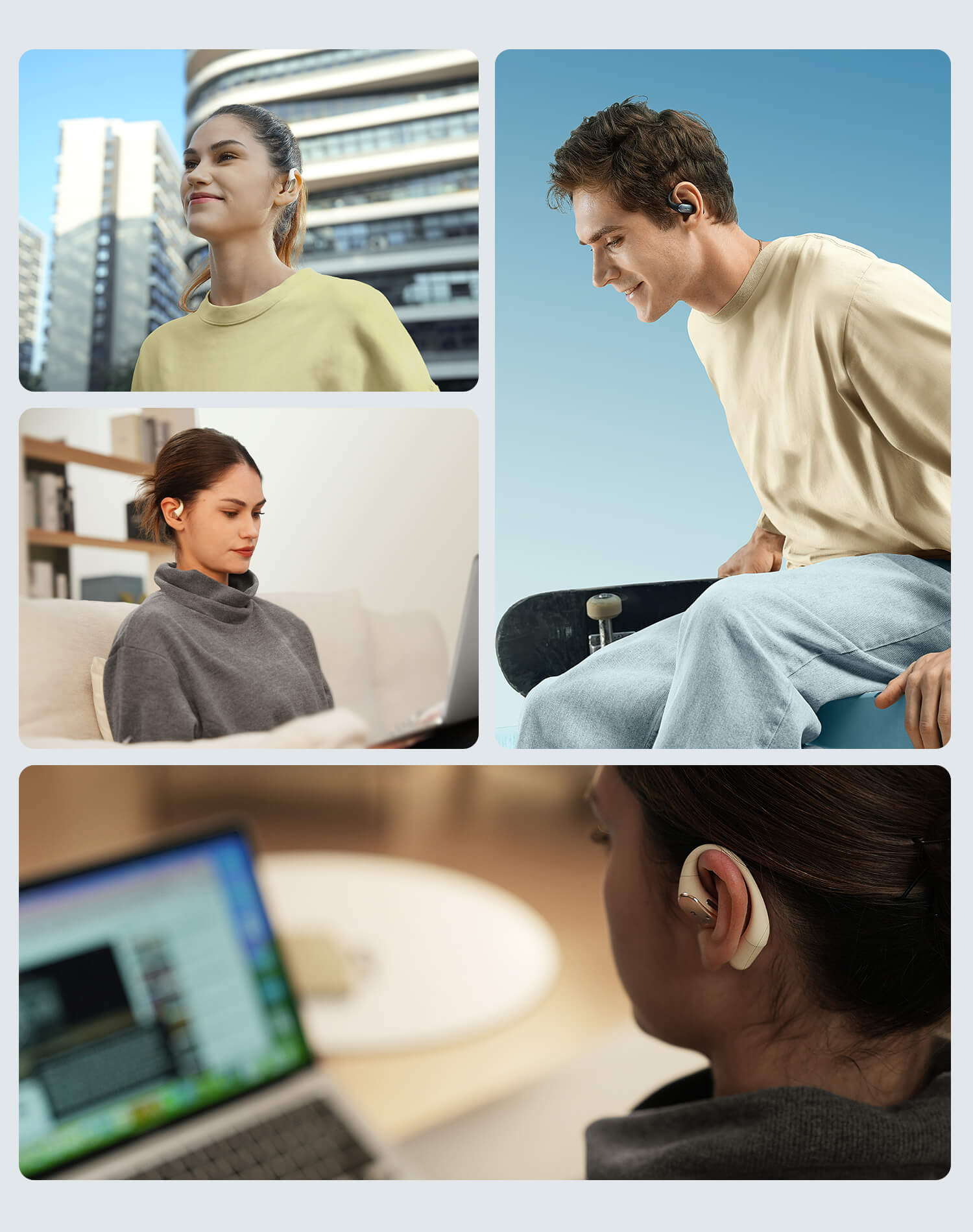 Single only 7.2g with an open-ear structure, it eliminates ear pressure. Made of slim titanium wire frame and super molecular liquid silicone material, the ear hooks are skin-friendly and slip-resistant.