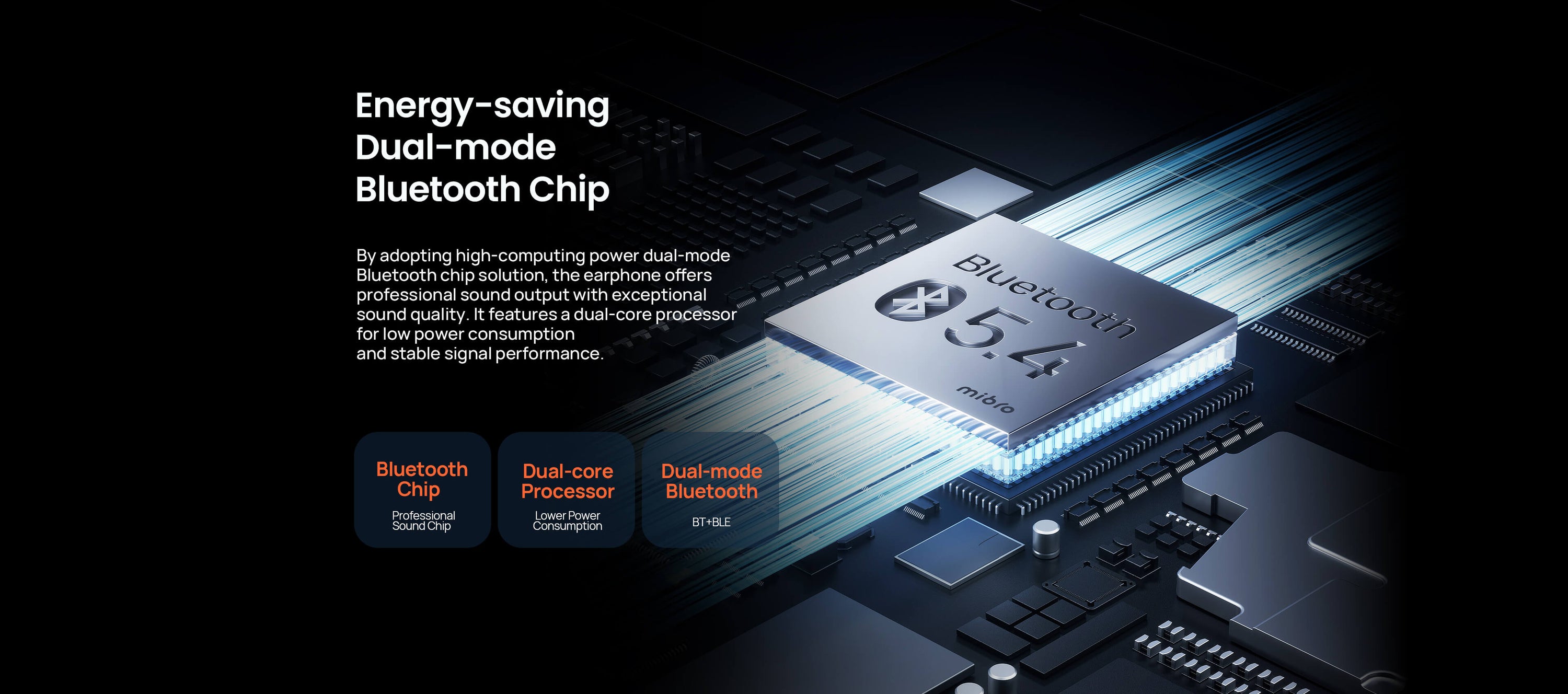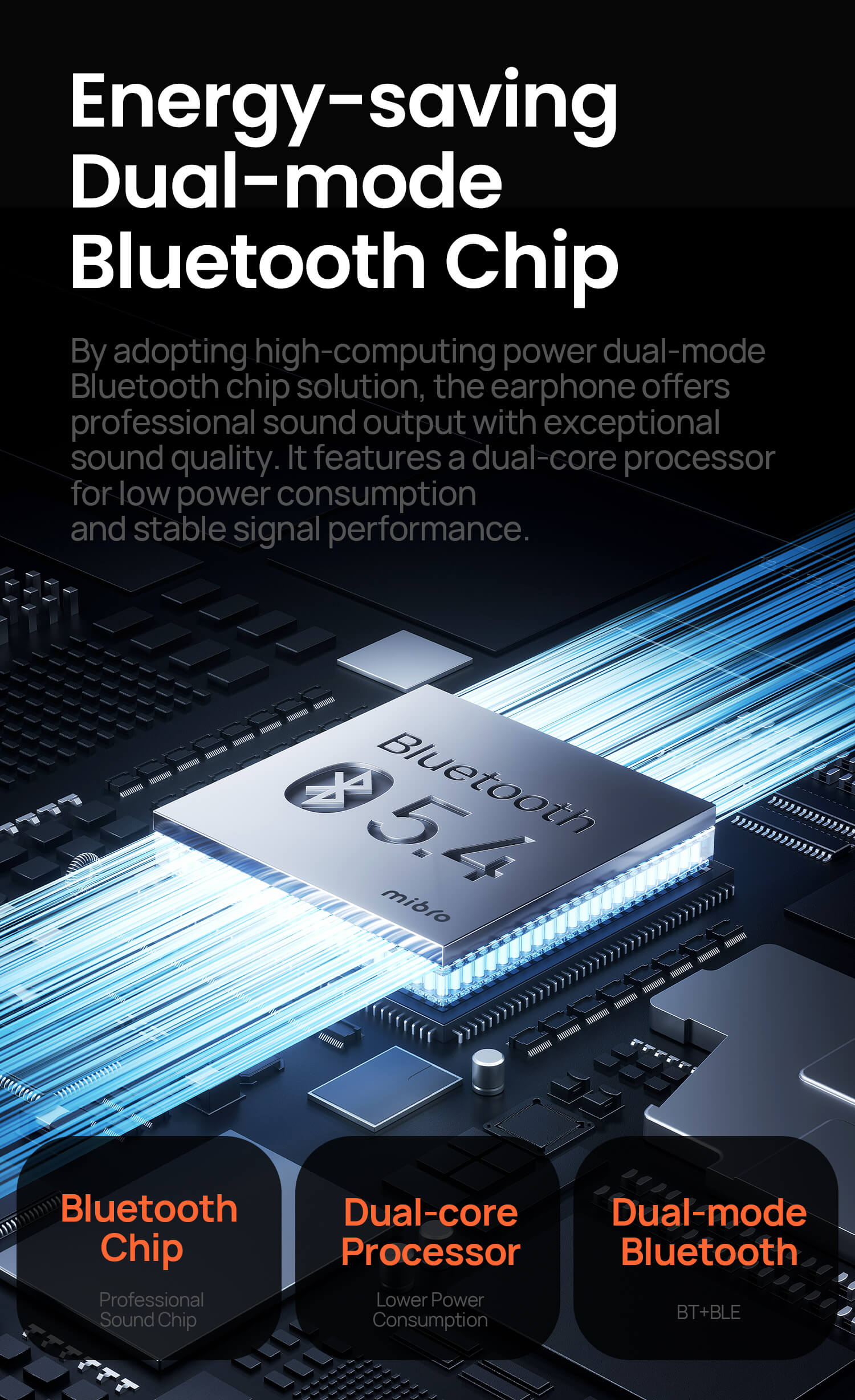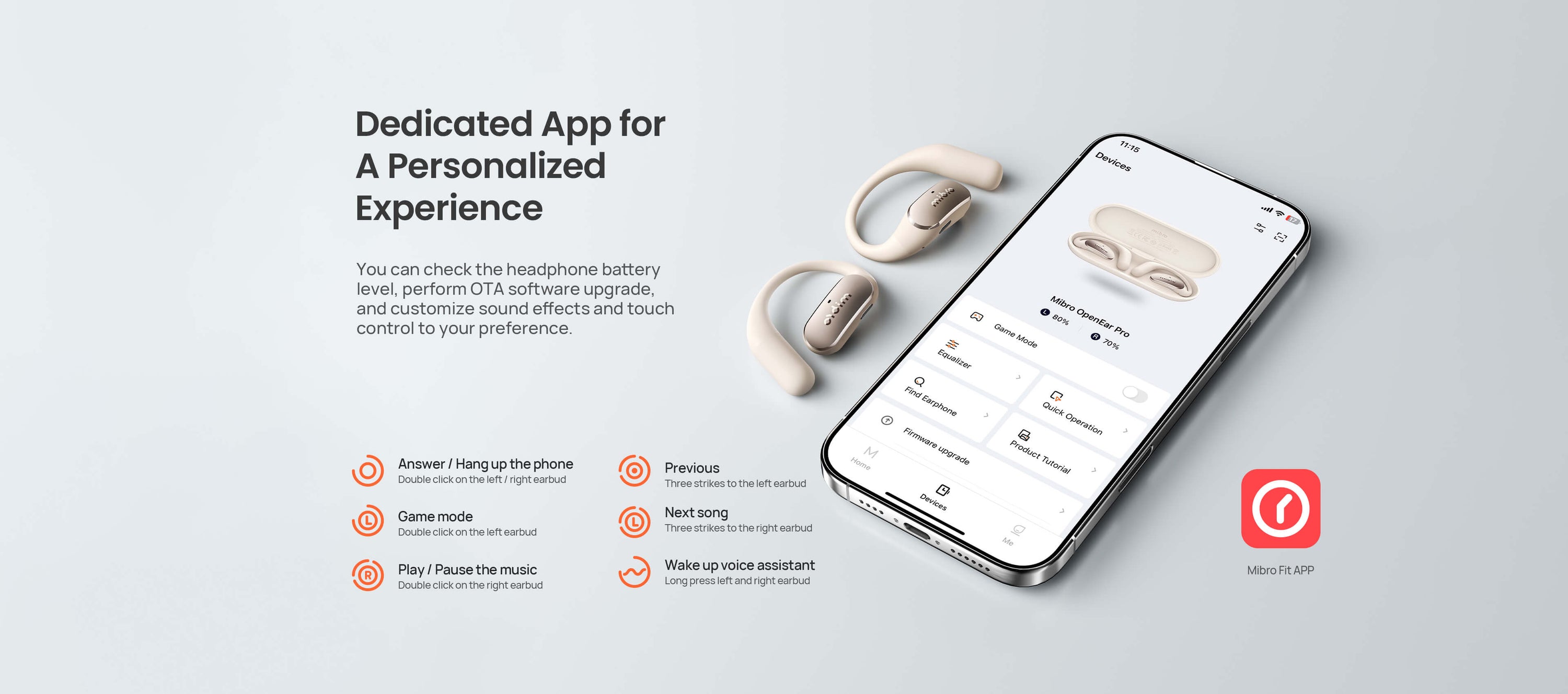 Tap to play/pause, swipe for volume. Bluetooth 5.4 connects two devices simultaneously (e.g., phone + laptop).