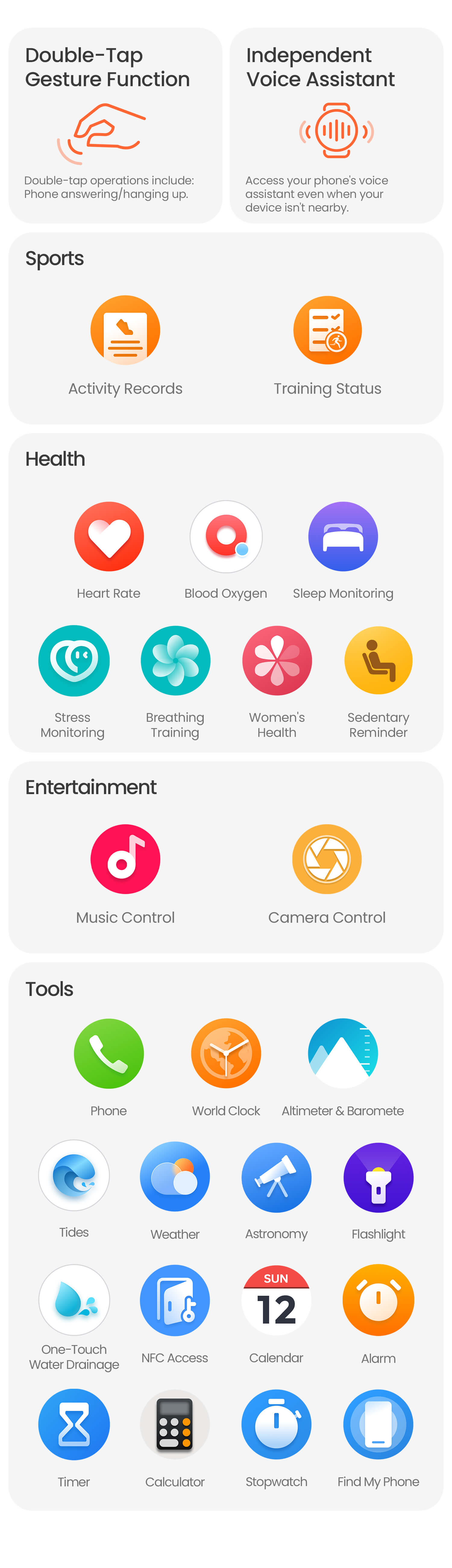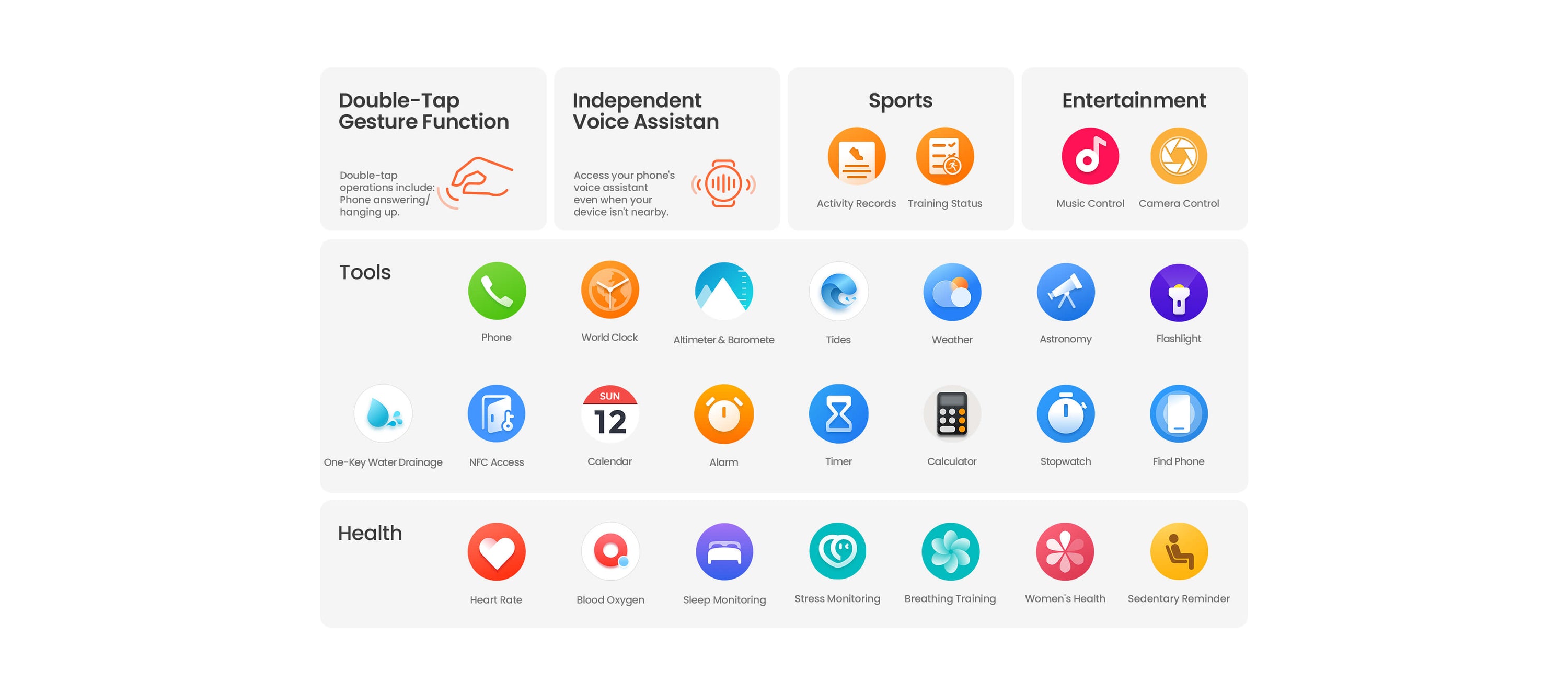 Heart rate, blood oxygen, exercise recording, breathing, pressure, sleep recording, timer, alarm clock, stopwatch, calculator, calendar, weather, women's health, finding phone, Bluetooth calling, music control, music playback, message reminder, incoming call reminder, health reminder, AI Intelligent Assistant, AI Schedule, AI Watch Face, voice assistant, one click drainage wake-up, etc