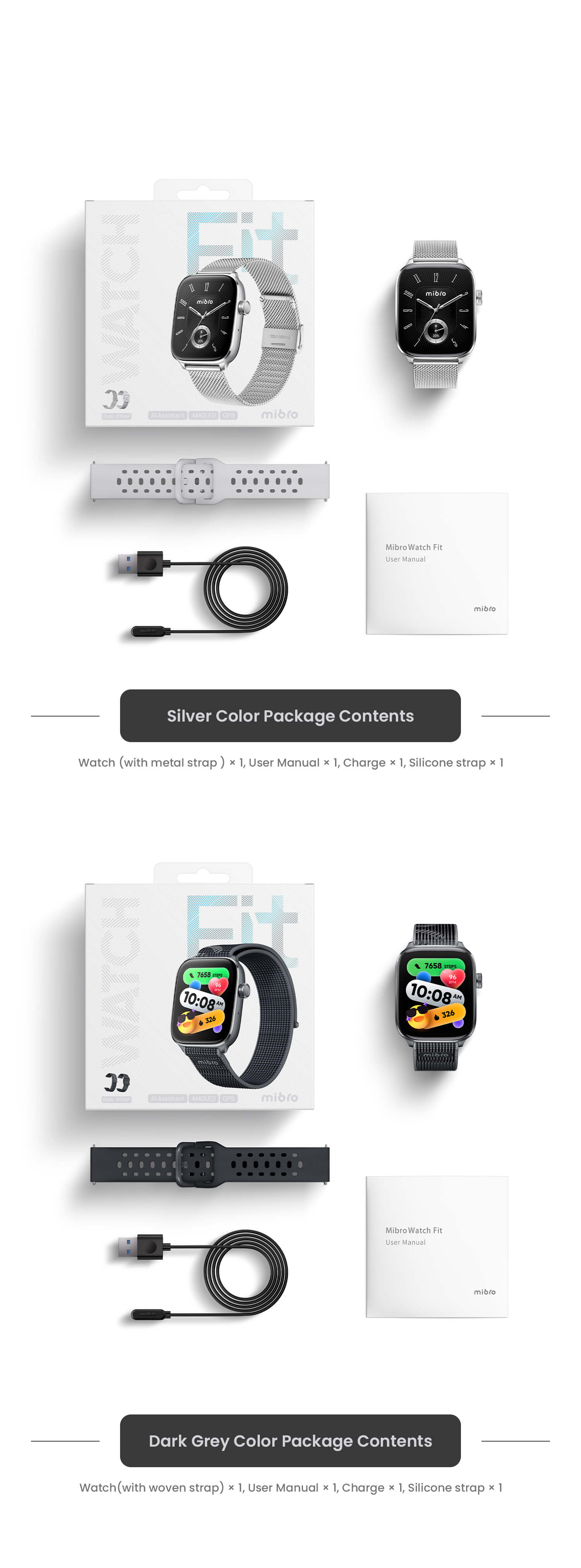 Includes one milanese strap, one silicone strap., and one charging cable.