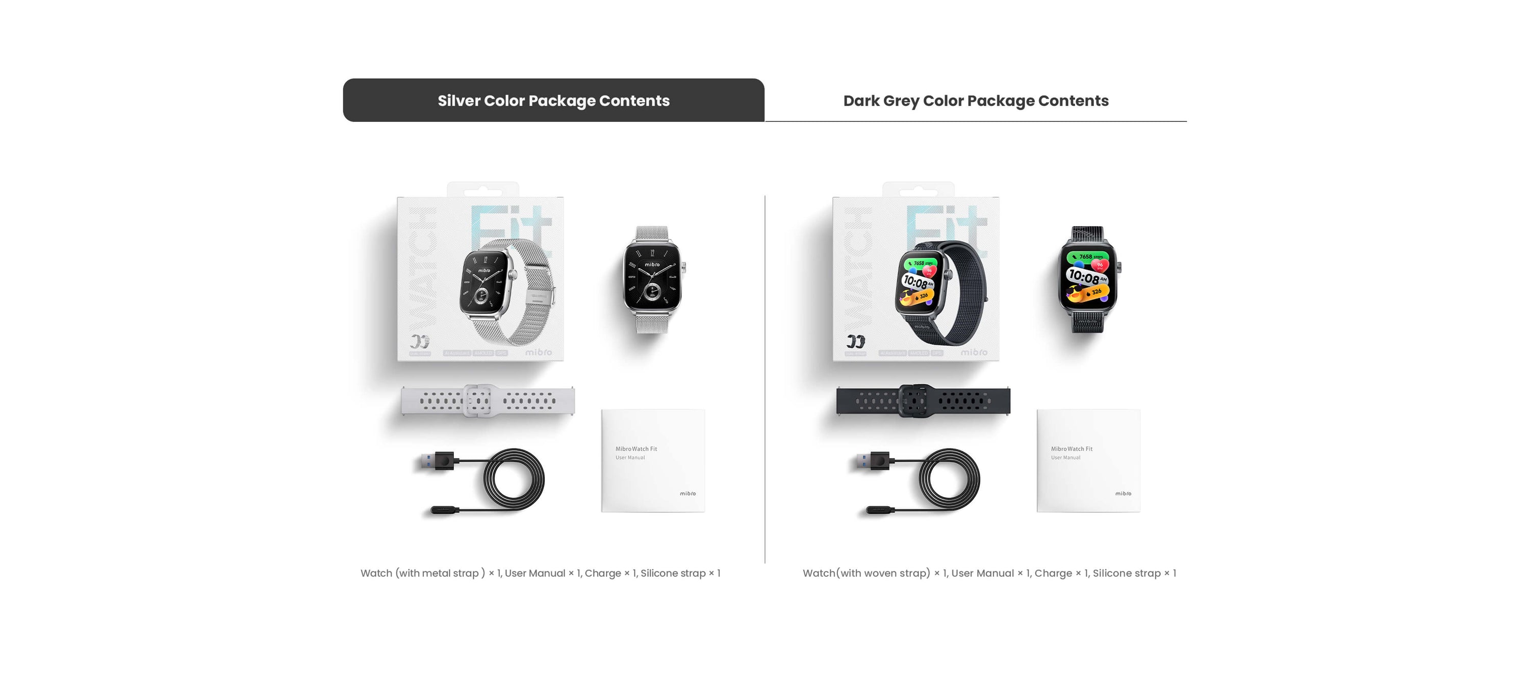 Includes one nylon woven strap, one silicone strap, and one charging cable.