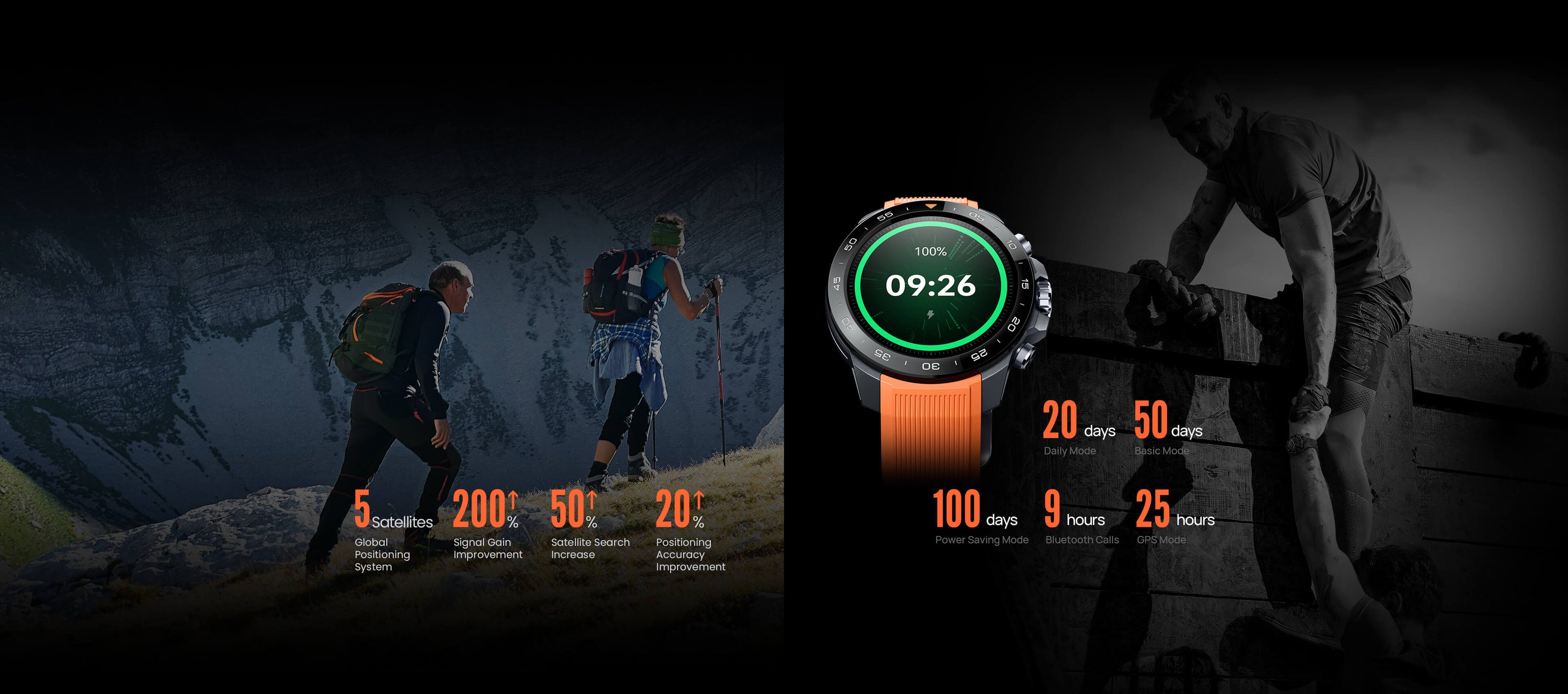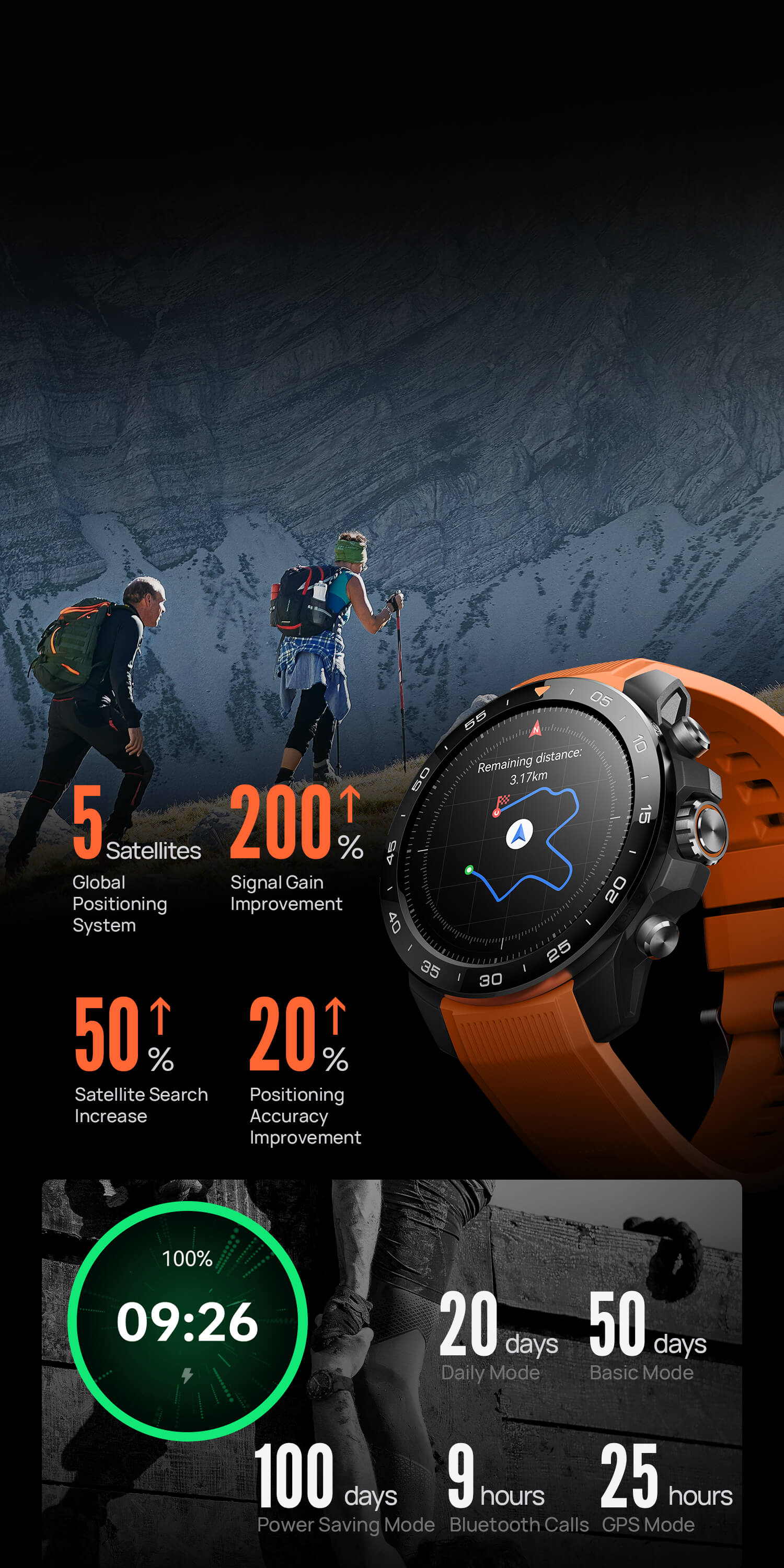 Massive battery life: 20 days (daily use), 50 days (basic), 25 hours GPS, or 9 hours calling.