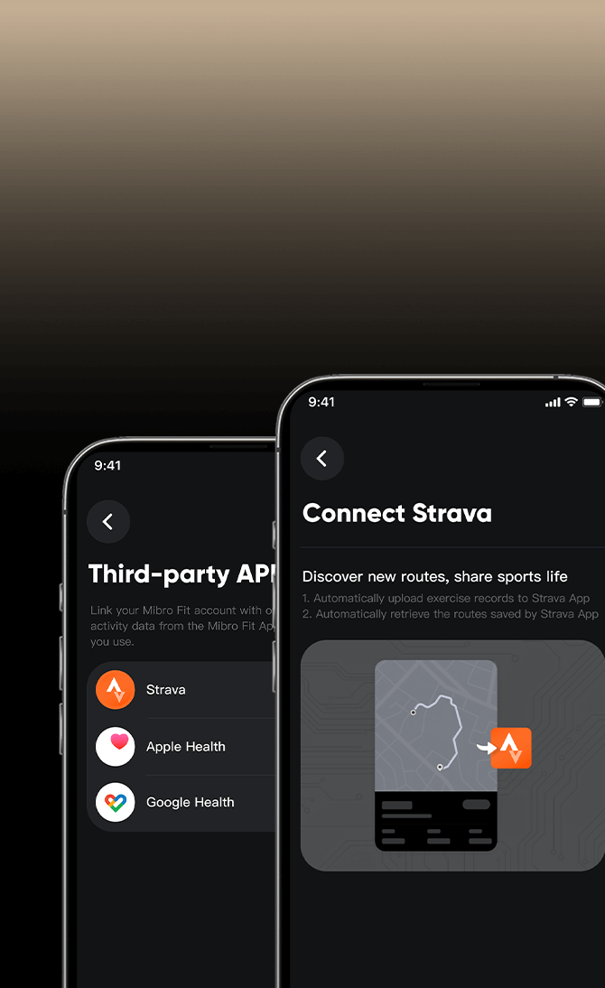 Connect effortlessly to Google Fit, Strava, and Apple Health. Stay on top of your fitness data and share your progress with ease.