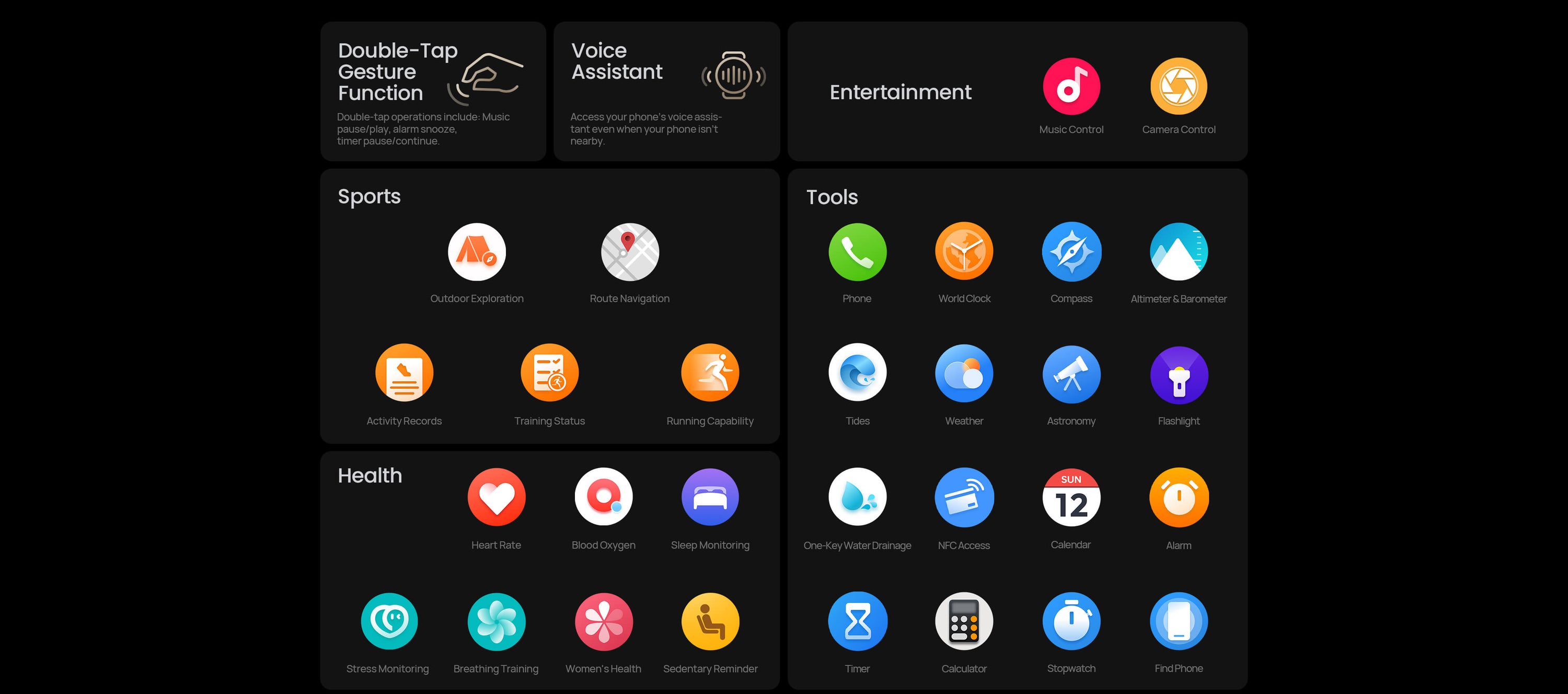 Health: Heart rate,Blood oxygen,Sleep,Stress,Breathing,Menstrual cycle,Sedentary reminder.