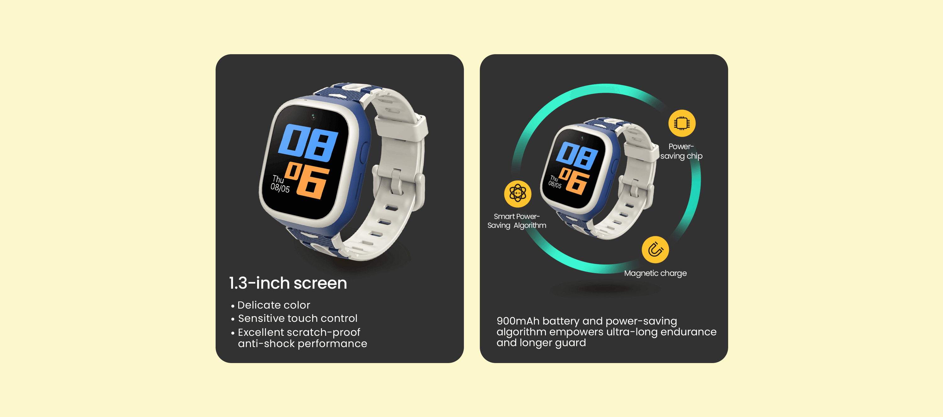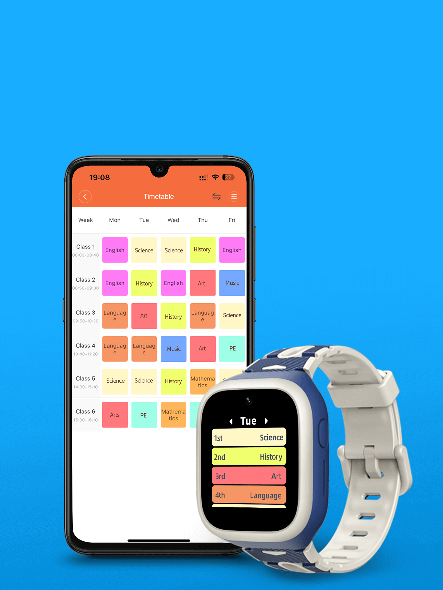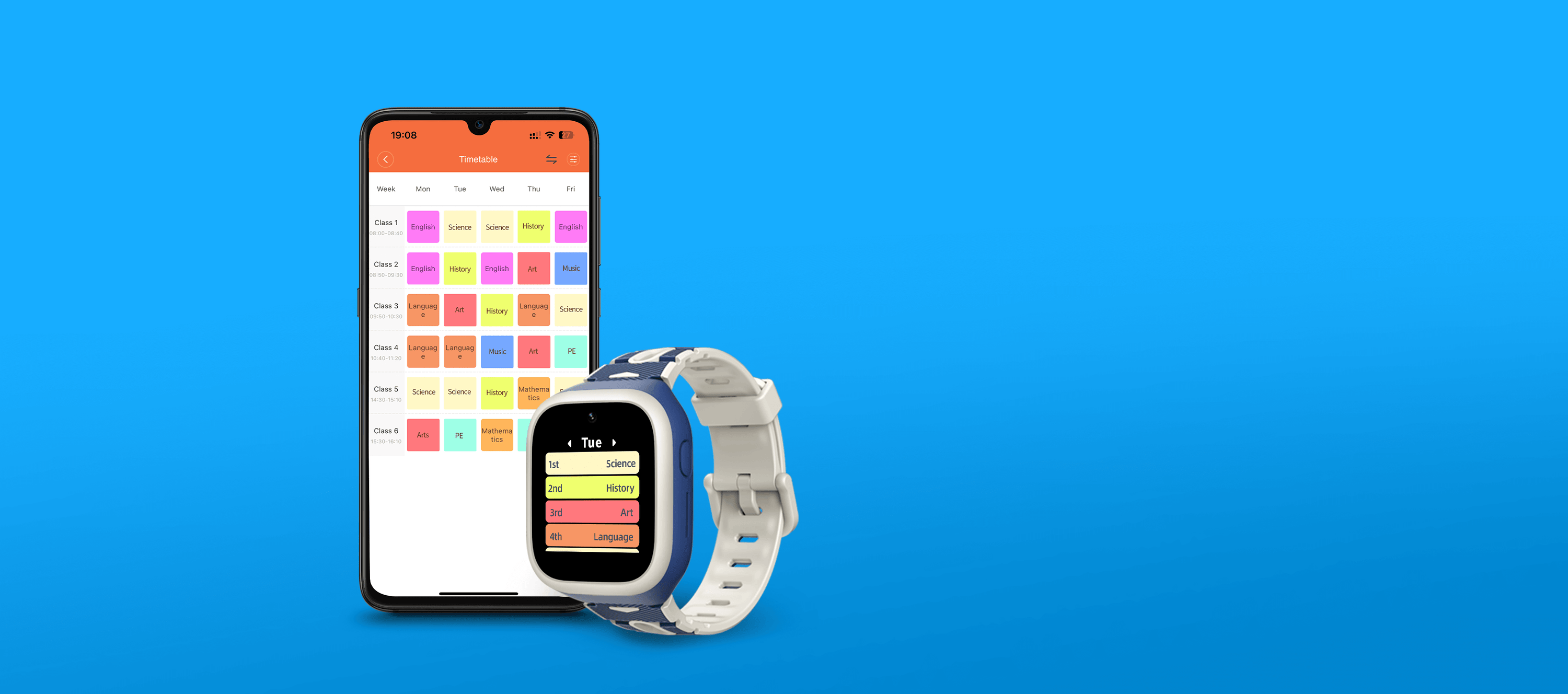 Timetable reminders help keep your child on schedule. Class Mode limits functions to time-checking during school hours. Press the emergency button sends alerts to parents in case of danger.