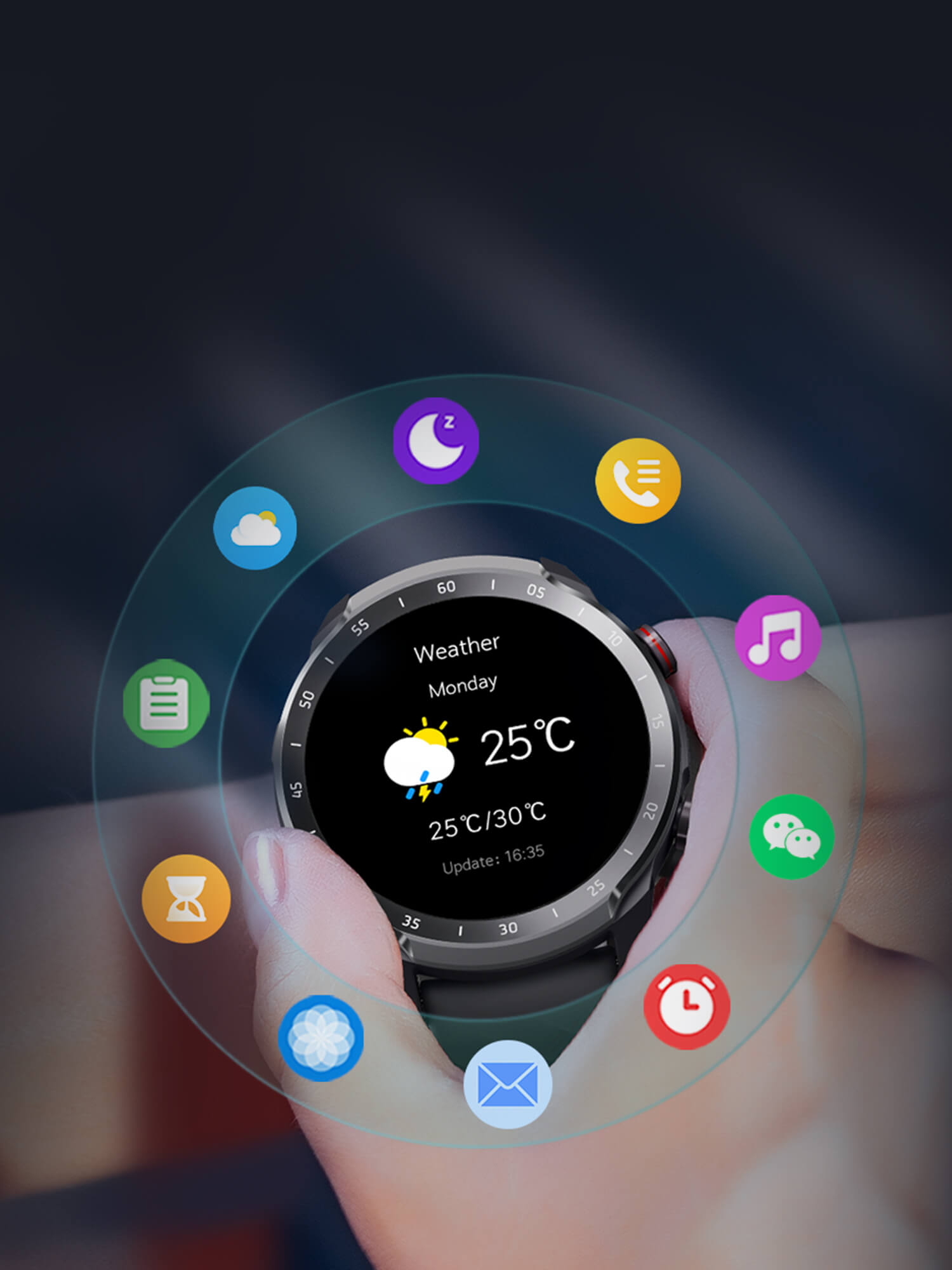 Supports BT calling, SMS, weather, alarms, and more daily reminders.