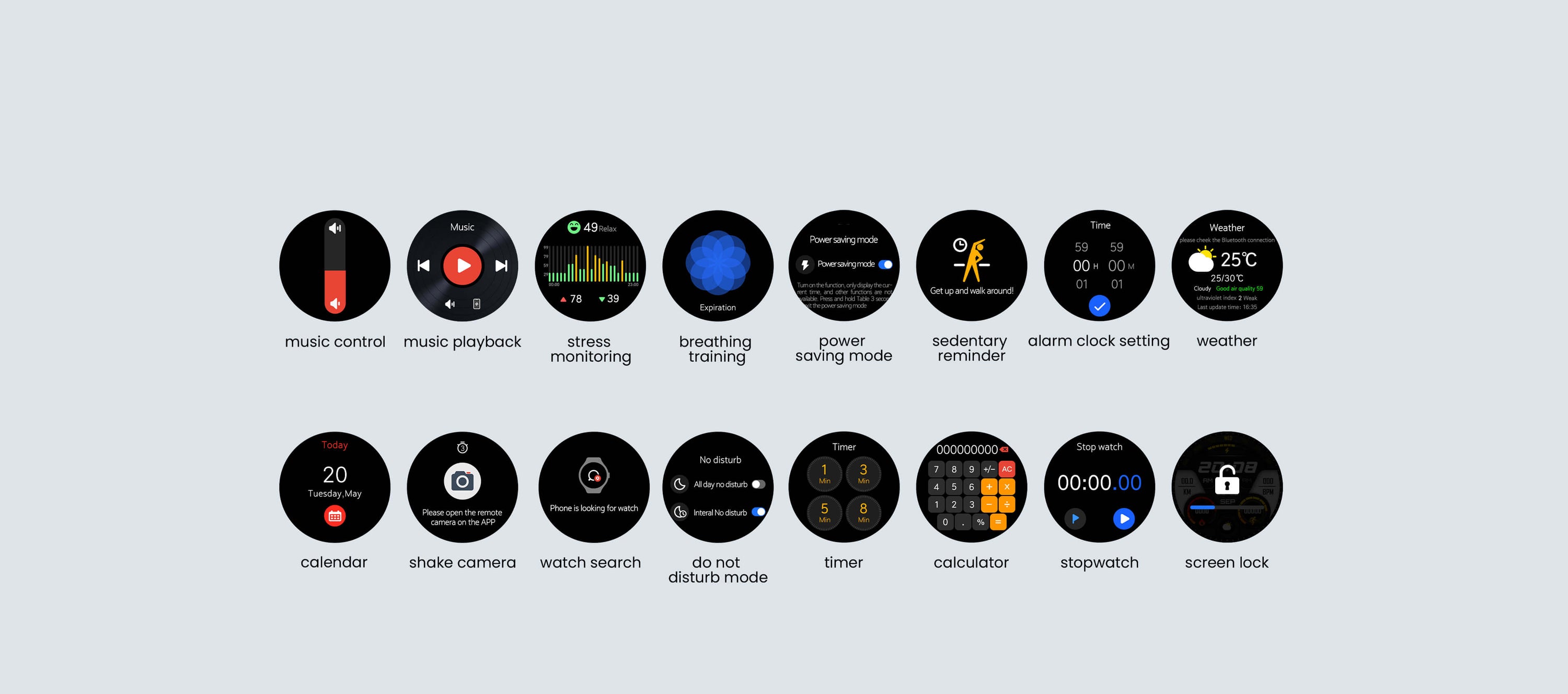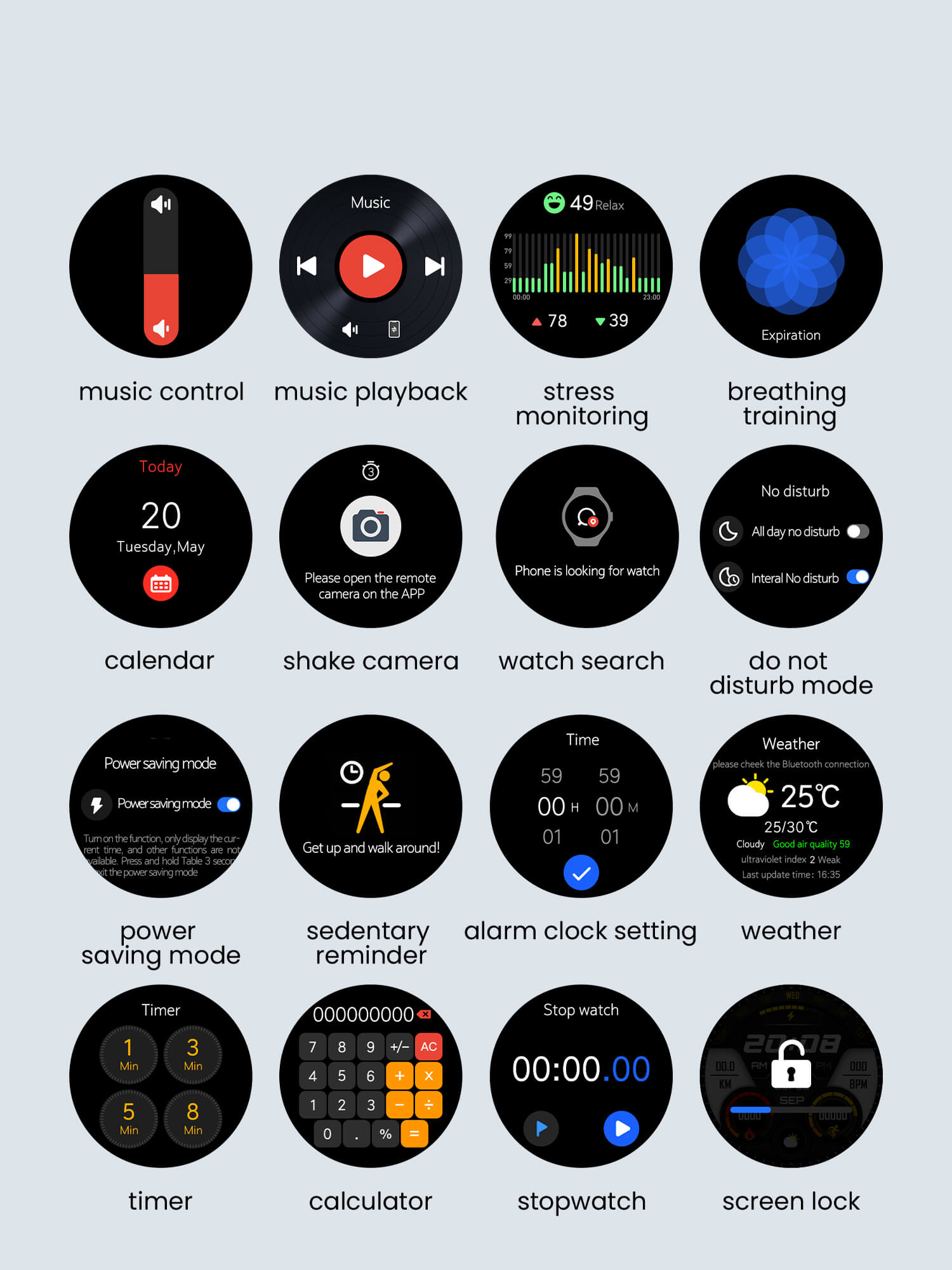 Heart Rate,SpO2,Motions record,Breath,Preesure,Sleepping record,Timer,Alarm,Stop watch,Calculator,Calendar,Weather,Women's health,Find your phone,Bluetooth call, Music control, Music playing,App message reminder,Incoming call reminder,Health Reminder..